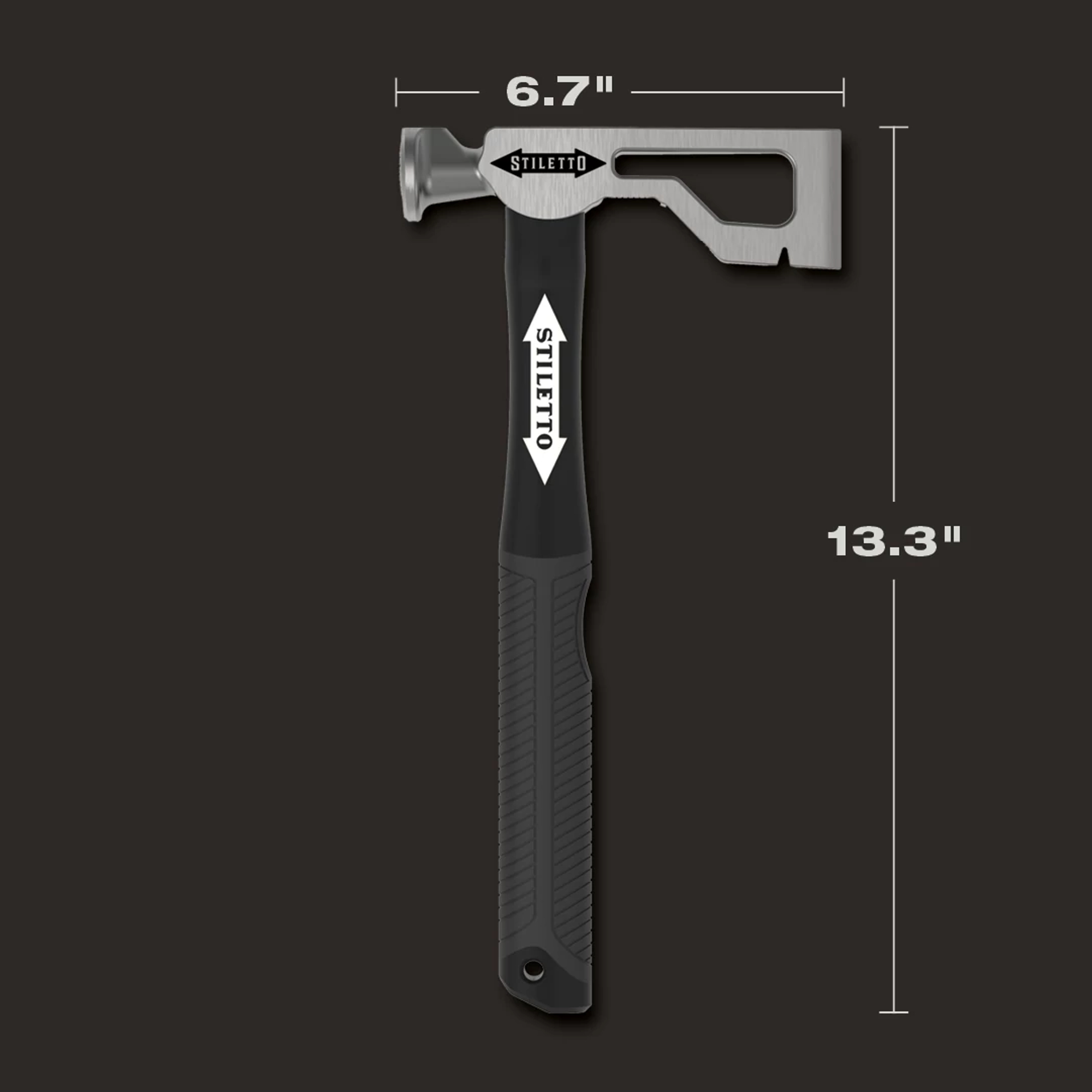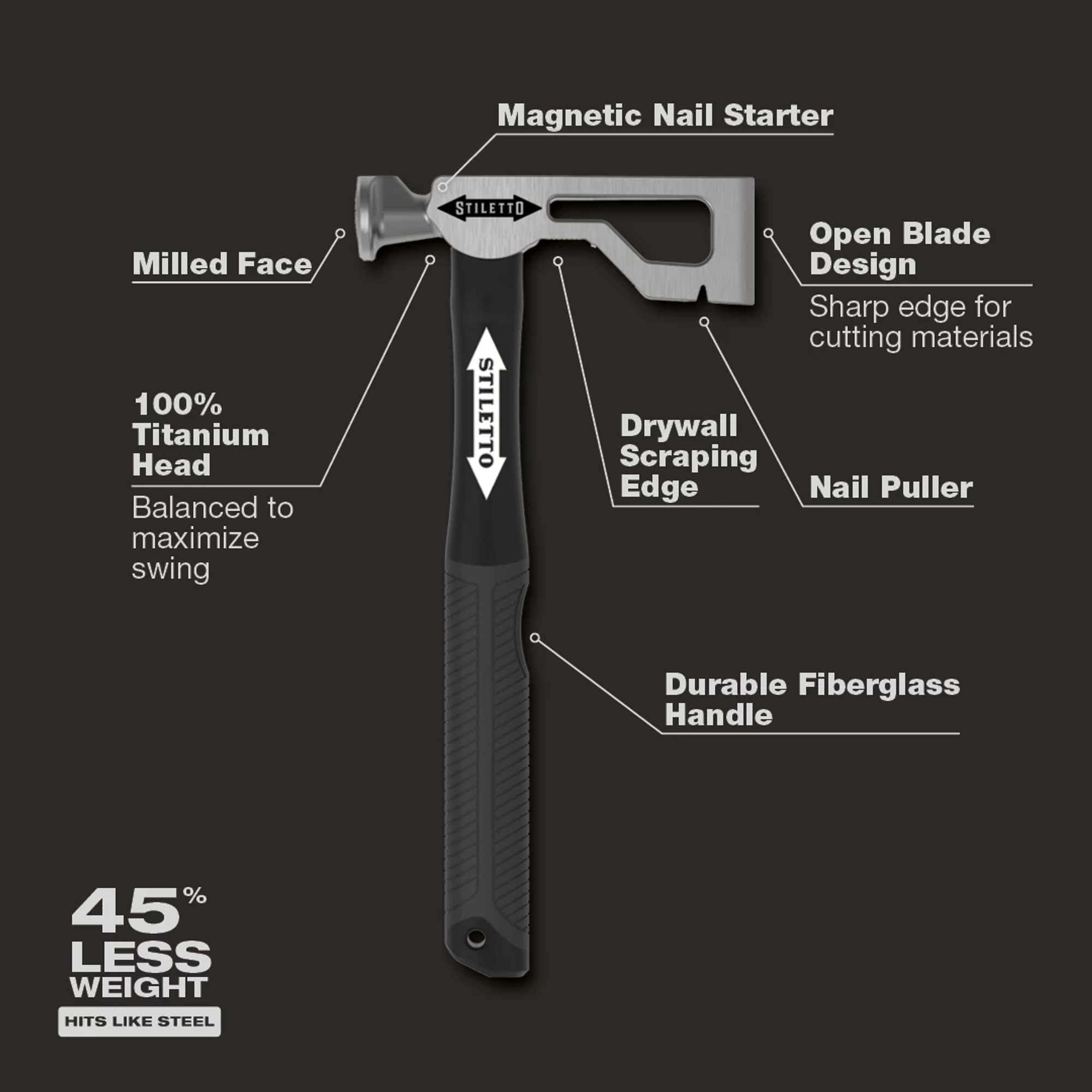 The Stiletto DRYAXE9F is a 9 oz. Titanium milled face hammer with a 13 in. Curved poly/FG handle. The hammer has a drywall Axe design and Stiletto’s signature magnetic nail starter. The DRYAXE9F has the comparable striking force of 24 oz. Steel hammer and is recommended for residential framing and remodeling. Stiletto Tool company has been synonymous with high quality hand tools dating back to 1849. With its long history and strong reputation, the brand has evolved into the modern day standard for innovative, lightweight, ergonomic, productive, and professional tools. We set the standard with our line of premium titanium hand tools that span numerous trades such as framing, remodeling, finish work, siding, demolition, concrete, and drywall. Titanium is 45% lighter weight while providing the same striking force and strength as steel. Titanium tools also produce less recoil shock which helps reduce carpal tunnel syndrome. The combination of these features means less down time, more productivity, and most importantly less pain while working.