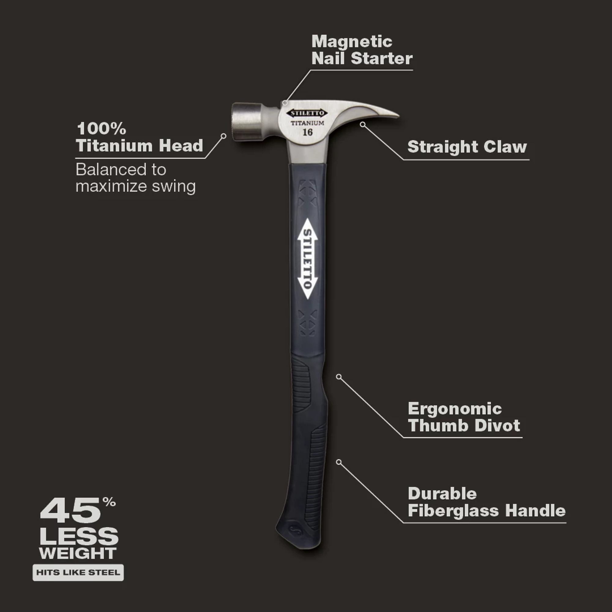 At 16 oz, this is the heavyweight of our solid titanium heads. The Stiletto TI16MC-F is a titanium milled face framing hammer with an 18 in. hybrid fiberglass handle. Our new fiberglass handles are more durable, have better feel, and have more prying strength than hickory. The hammer has a straight claw design and Stiletto’s signature magnetic nail starter. The TI16MC-F has the comparable striking force of 28 oz steel hammer and is recommended for residential framing and remodeling. Stiletto Tool company has been synonymous with high quality hand tools dating back to 1849. With our long history and strong reputation, the brand has evolved into the modern day standard for innovative, lightweight, ergonomic, productive, and professional tools. We set the standard with our line of premium titanium hand tools that span numerous trades such as framing, remodeling, finish work, siding, demolition, concrete, and drywall. Titanium is 45% lighter weight while providing the same striking force and strength as steel. Titanium tools also produce 10 times less recoil shock which helps reduce carpal tunnel syndrome. The combination of these features means less down time, more productivity, and most importantly less pain while working.