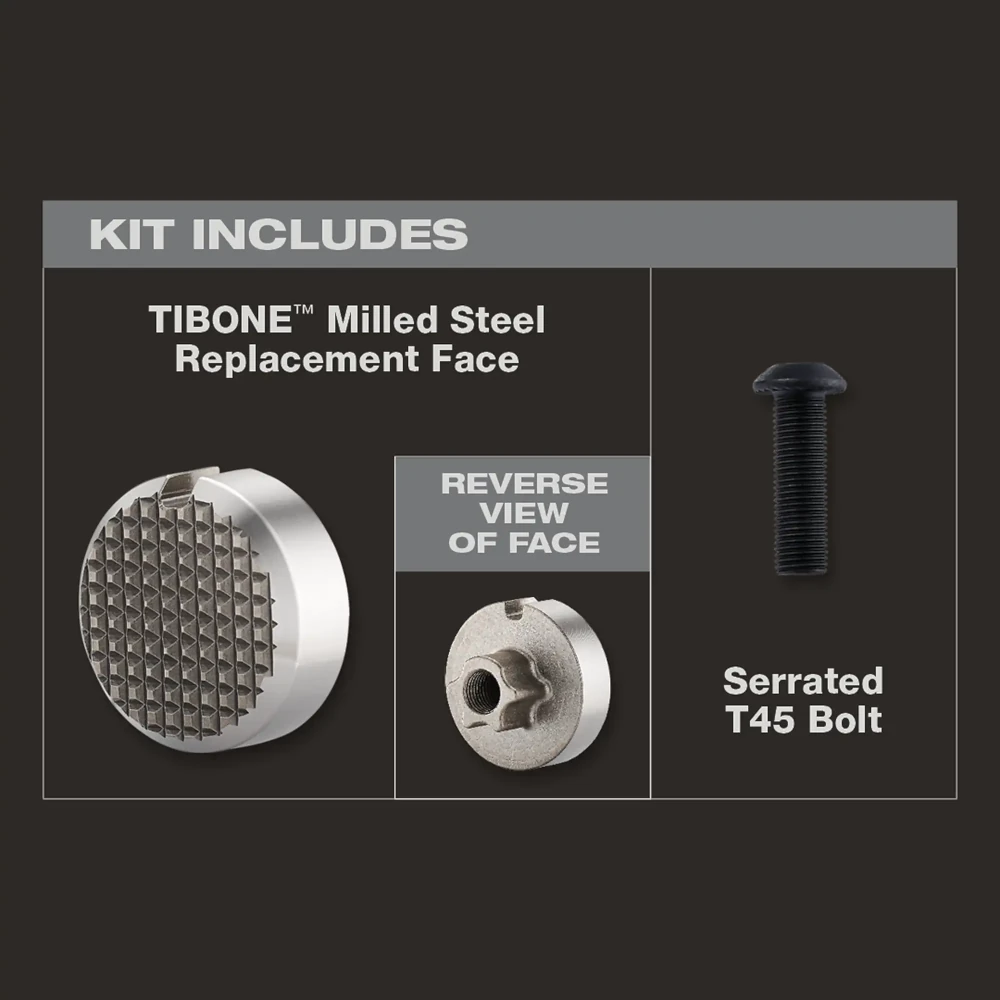 The STILETTO® Milled Steel Replacement D-Face is a durable replacement striking face designed to fit select TIBONE™ hammers. Built from milled steel for long-lasting performance, it’s ideal for restoring your hammer’s striking surface and keeping it jobsite-ready. The kit includes hardware and installation instructions, along with a serrated T45 bolt, and features an anti-rotational design for a secure fit.