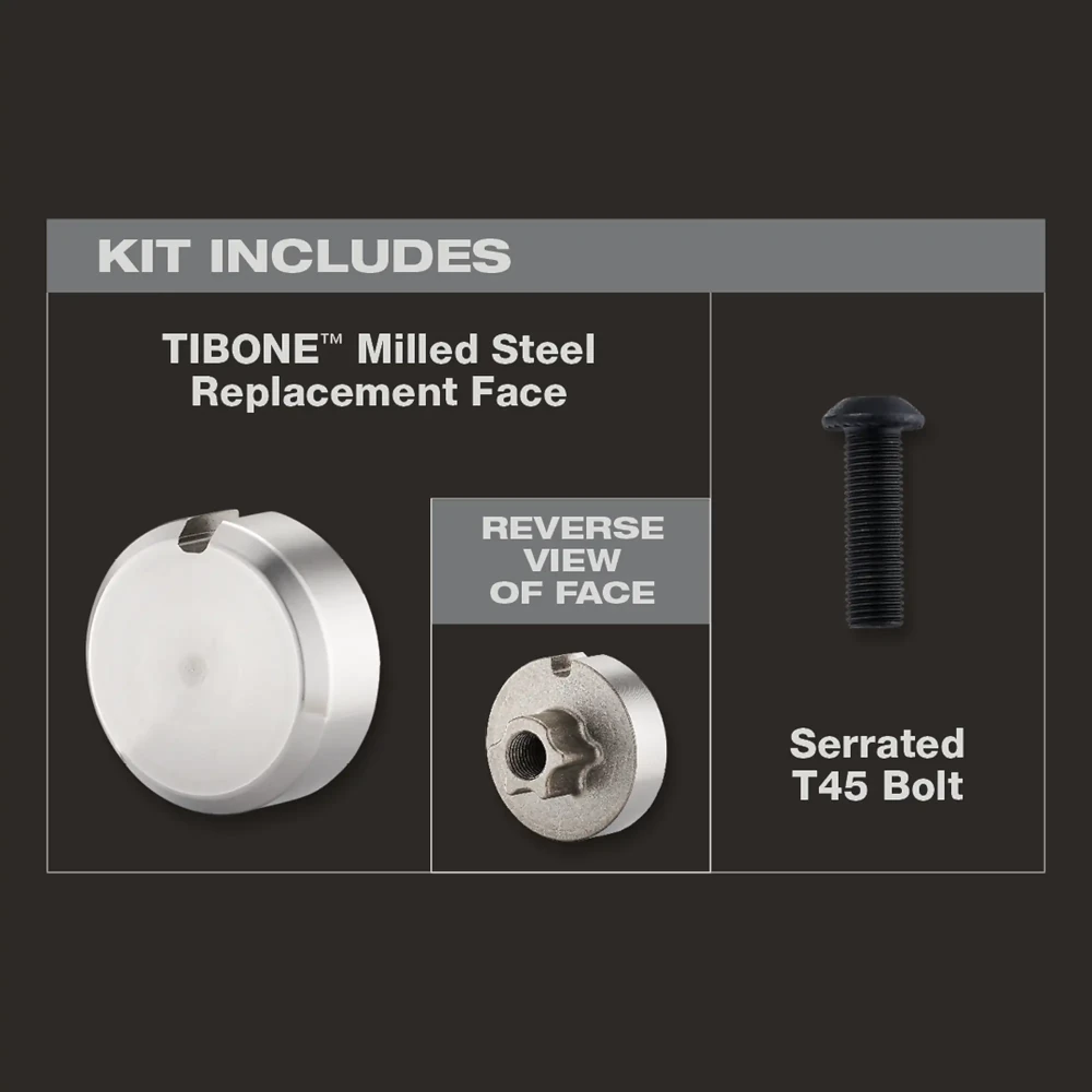 The STILETTO® Smooth Steel Replacement D-Face is a durable replacement striking face designed to fit select TIBONE™ hammers. Made with a smooth steel face for long-lasting performance, it’s ideal for replacing a worn face and keeping your hammer working like it should. The kit includes hardware and installation instructions, plus a serrated T45 bolt, and features an anti-rotational design for a secure, reliable fit.