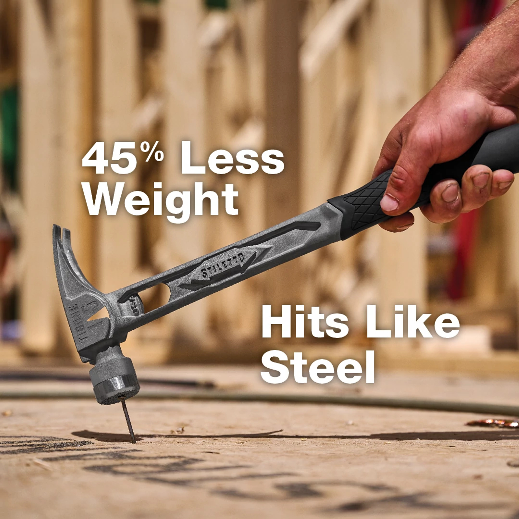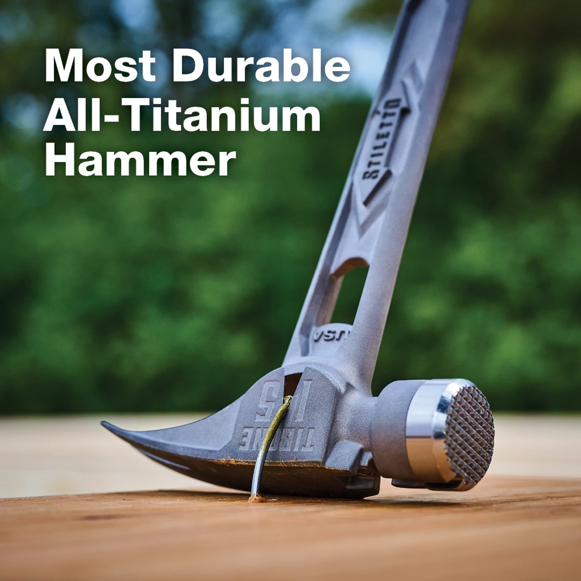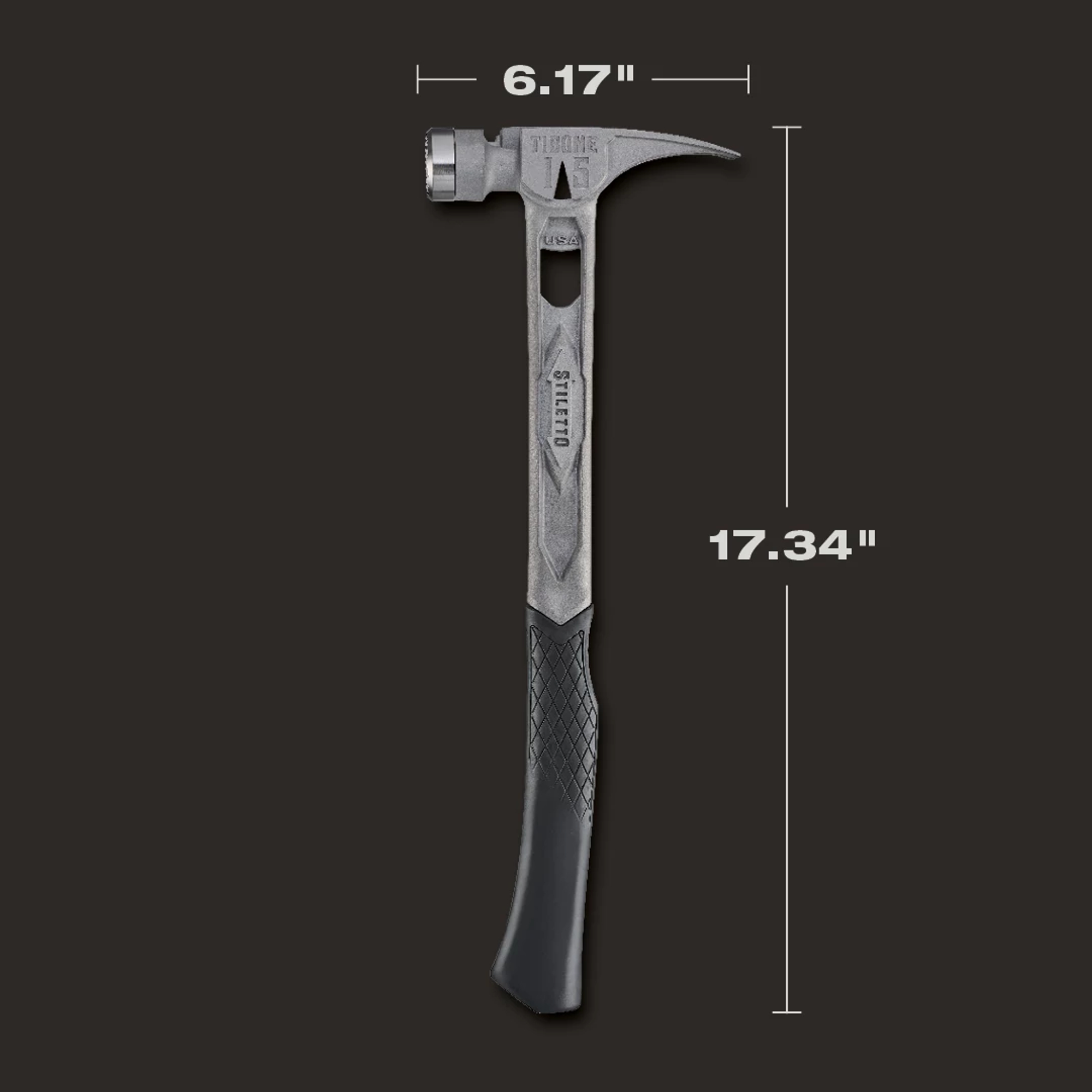 The STILETTO® 15oz TIBONE™ Hammer with Milled Steel Face and Curved Handle is Stiletto Tool’s most powerful and most durable hammer. This All-Titanium hammer is 45% less weight and hits like steel. The durable TIBONE™ design is best for framing and pulling nails. The 180° side nail puller and Magnetic Nail Starter fit up to 16D and Duplex Nails. The TIBONE™ Titanium Framing Hammer features a replaceable steel face and multiple grip colors, extending the life of the hammer and providing a personal touch.