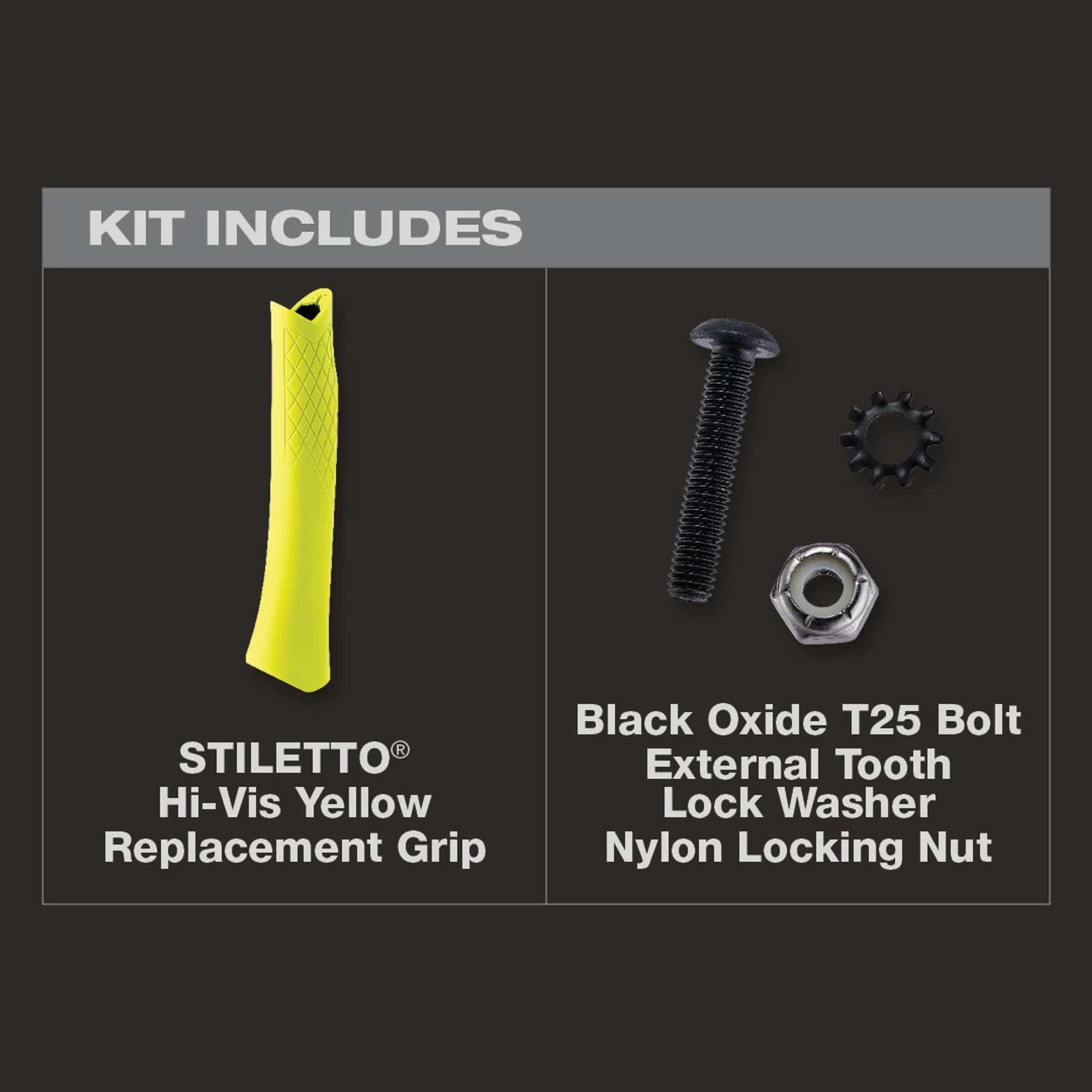 The STILETTO® Hi-Vis Yellow Replacement Grip extends the life of your hammer while providing a personal touch. It is easy to install and remove on the jobsite with minimal tools. The STILETTO® Replacement Grip is available in 6 colors and includes a Black Oxide T25 Bolt, Nylon Locking Nut, and External Tooth Lock Washer.