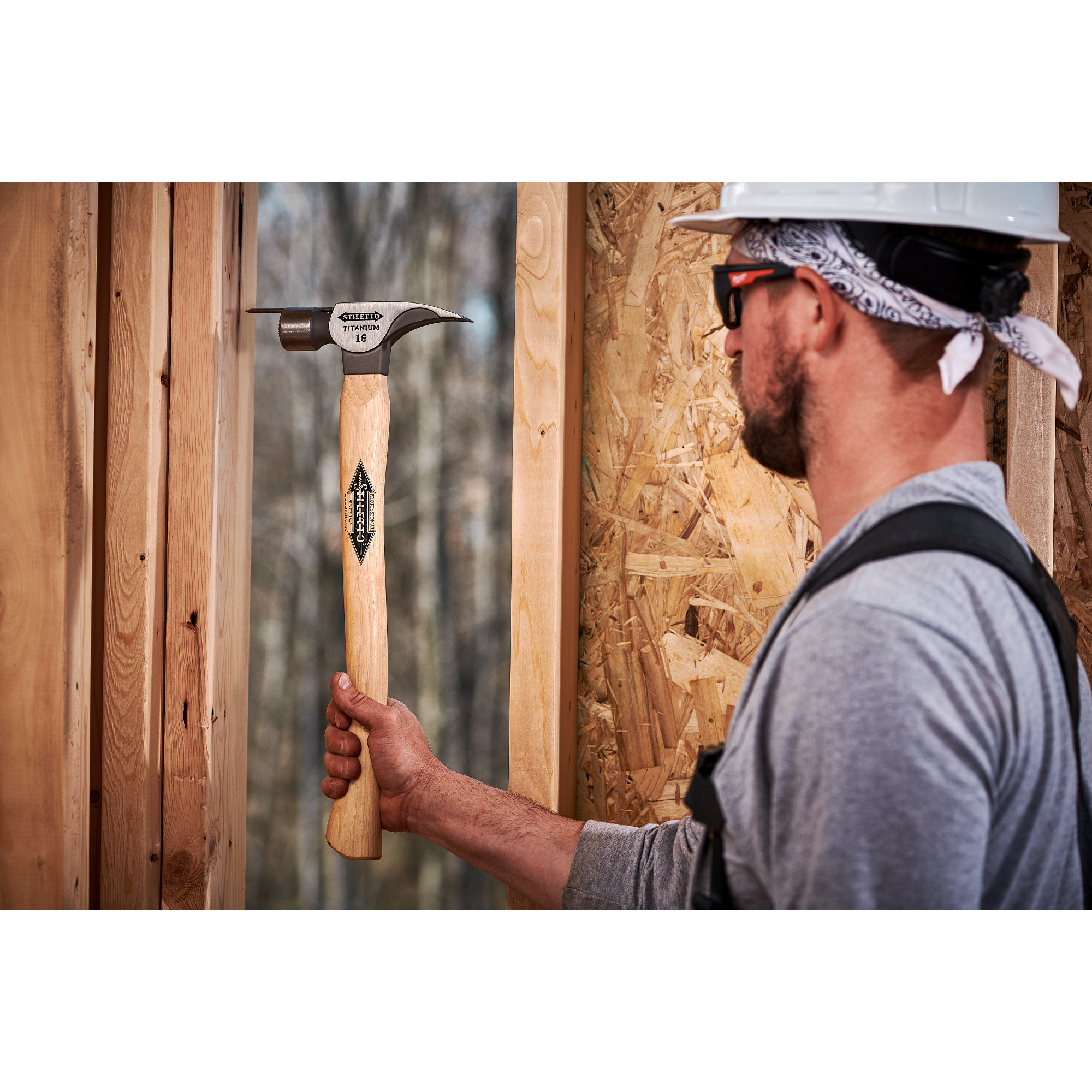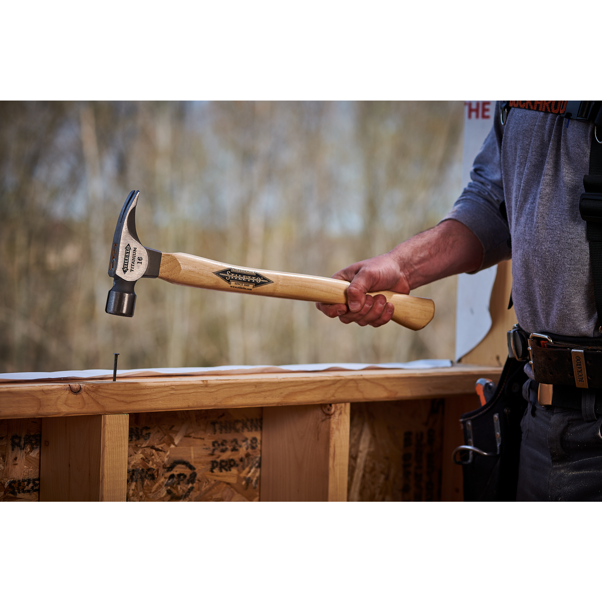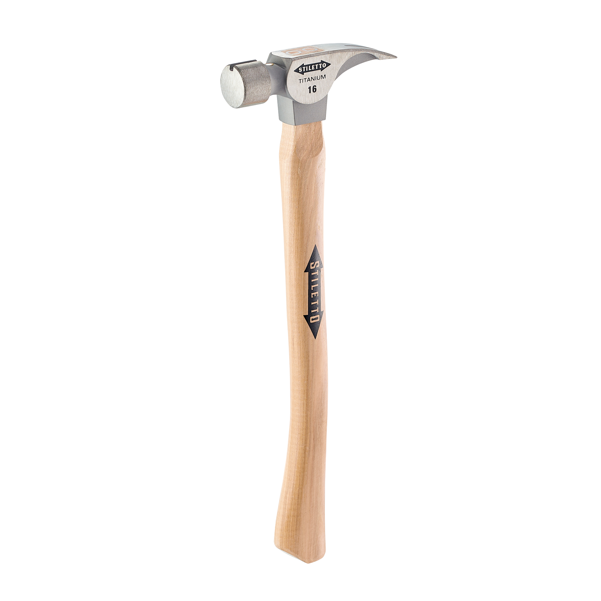 The Stiletto TI16SC is a 16 oz titanium smooth face hammer with an 18 in. curved hickory handle. The hammer has a straight claw design and Stiletto’s signature magnetic nail starter. The TI16SC has the comparable striking force of a 28 oz steel hammer and is recommended for residential framing and remodeling. Stiletto Tool company has been synonymous with high quality hand tools dating back to 1849. With our long history and strong reputation, the brand has evolved into the modern day standard for innovative, lightweight, ergonomic, productive, and professional tools. We set the standard with our line of premium titanium hand tools that span numerous trades such as framing, remodeling, finish work, siding, demolition, concrete, and drywall. Titanium is 45% lighter weight while providing the same striking force and strength as steel. Titanium tools also produce 10 times less recoil shock which helps reduce carpal tunnel syndrome. The combination of these features means less down time, more productivity, and most importantly less pain while working.