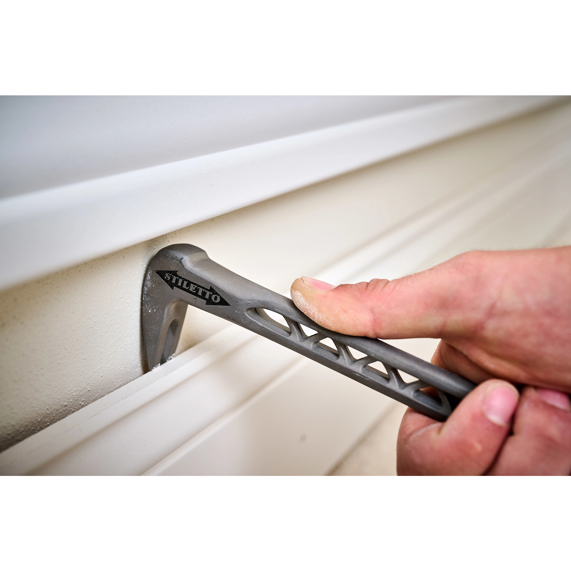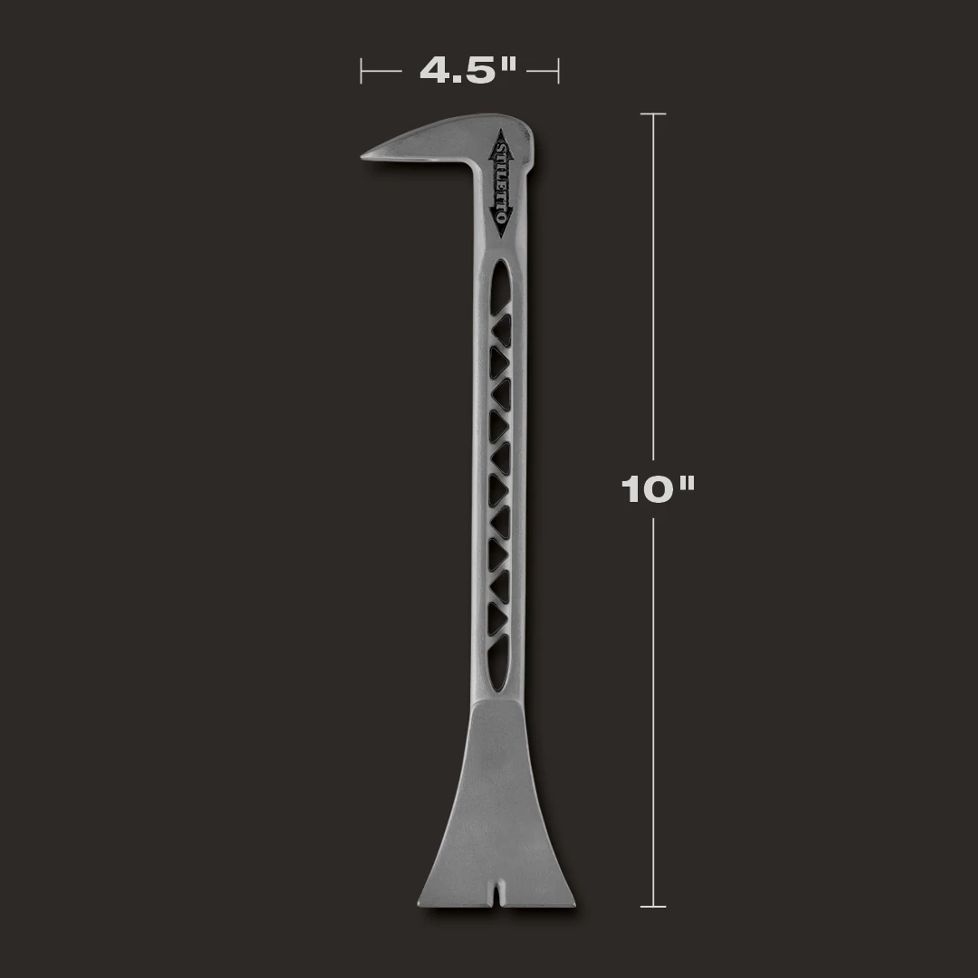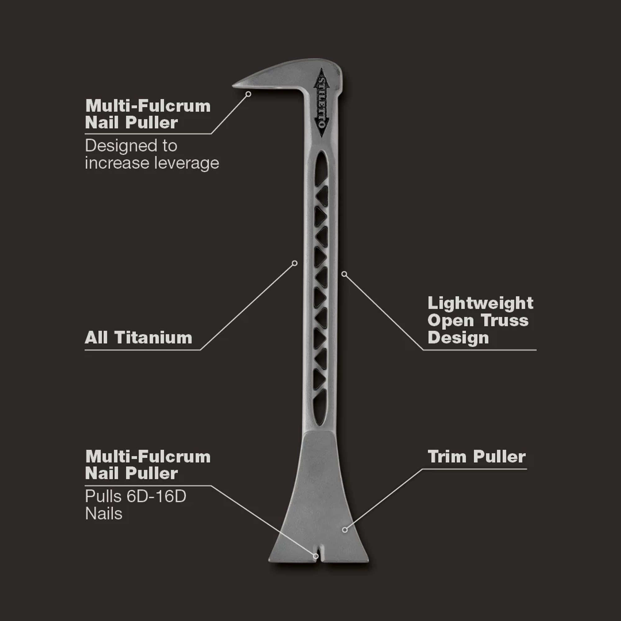 Our Stiletto TrimBar 5 is a 8.5 in. solid titanium trim pry bar nail and moulding puller. The TrimBar 5 has titanium strength, yet is lightweight in the hand & pouch. It features a wide curved moulding puller tip that removes trim cleanly and easily. Stiletto Tool company has been synonymous with high quality hand tools dating back to 1849. With our long history and strong reputation, the brand has evolved into the modern day standard for innovative, lightweight, ergonomic, productive, and professional tools. We set the standard with our line of premium titanium hand tools that span numerous trades such as framing, remodeling, finish work, siding, demolition, concrete, and drywall. Titanium is 45% lighter weight while providing the same striking force and strength as steel. Titanium tools also produce 10 times less recoil shock which helps reduce carpal tunnel syndrome. The combination of these features means less down time, more productivity, and most importantly less pain while working.