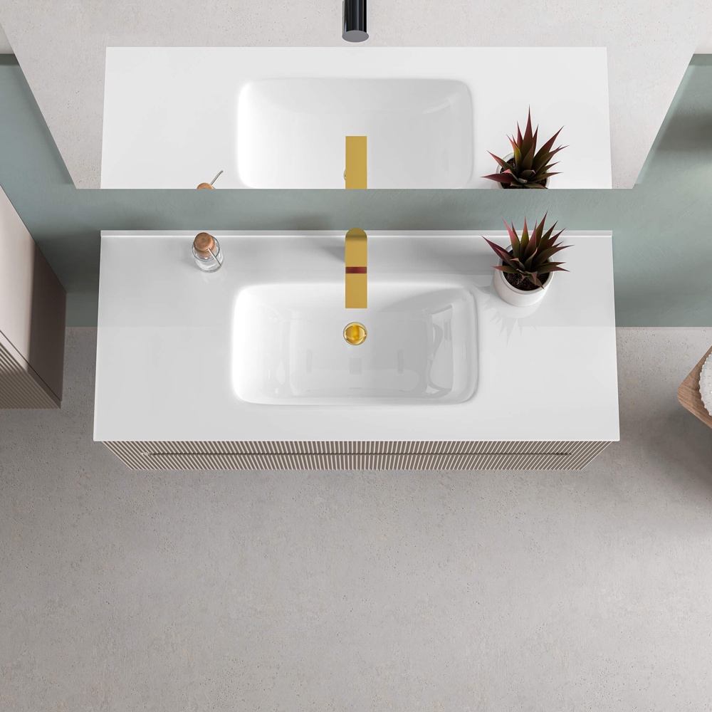 • High-gloss white porcelain top with integrated washbasin