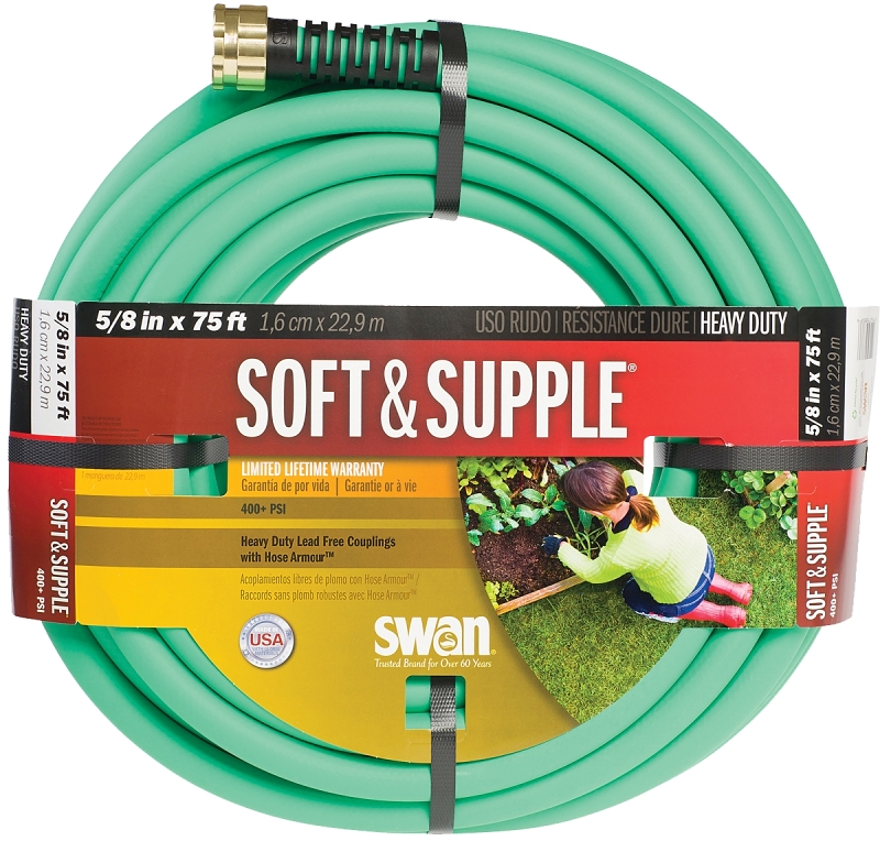 The SWAN soft and supple 75 ft 5/8 in water hose combines flexibility and strength. Say goodbye to twisted hoses with this 75 ft flexible garden hose. It can be stretched around the garden with ease and the abrasion-resistant cover of the hose means you’ll be using this one for many seasons. The crush-proof aluminum couplings on this flexible garden hose of 75 ft. In L are lead-free and afford maximum protection. You won’t have to worry about them being damaged when they are stepped on or run over by light garden equipment. This is a hose made for large outdoor areas. It boasts an amazing 400 psi burst strength that will give you great coverage. Made with pride in the USA, the 75 ft. Flexible hose from SWAN’s is functional and versatile. From watering the lawn to hosing down the deck, this hose does it all.