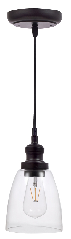 Sylvania Pendant Light, 120 V, Wattage Rating: 6.5 W, Number of Lamps: 1, Lamp Type: LED, Lamp Base: E26, Bulb Shape: ST19, Average Life: 15,000 hr, Color Temperature: 2700 K, Lumens: 800 Lumens, Shade Type: Bell, Shade Material: Glass, Ballast/Driver Type: Dimmable, Cord Size: 42 in, Fixture Material: Metal, Fixture Color: Black, Fixture Finish: Matte, Dimensions: 5.51 in Dia, Includes: (1) LED ST19 800 Lumens Filament Lamp