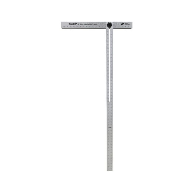 The Empire Level heavy duty adjustable T-Square 48-Inch aluminum drywall square is designed for general carpentry use. It is perfect for marking cut lines on sheets of plywood, OSB, drywall, and other board materials. The square is built for durability and easy use, with heavy-duty extruded aluminum blade and head with a clear anodized finish. The blade is 1/4-inch thick and marked in black with easy-to-read gradations in 1/8 and 1/16-Inch. The precision-machined head and blade lock together for a perfect 30, 45, 60 and 75-Degree angles, with the ability to adjust to any angle quickly, without disassembly. The square folds flat for easy transport. It is covered by a 5-year limited warranty.