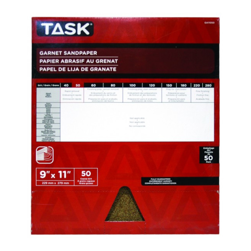 Task Sandpaper, 11 in L, 9 in W, 50 Grit, Grit Grade: Coarse, Garnet Abrasive, Applicable Materials: Wood