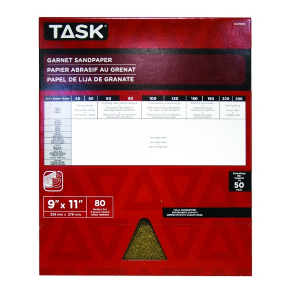 Task Sandpaper, 11 in L, 9 in W, 80 Grit, Grit Grade: Medium, Garnet Abrasive, Applicable Materials: Wood