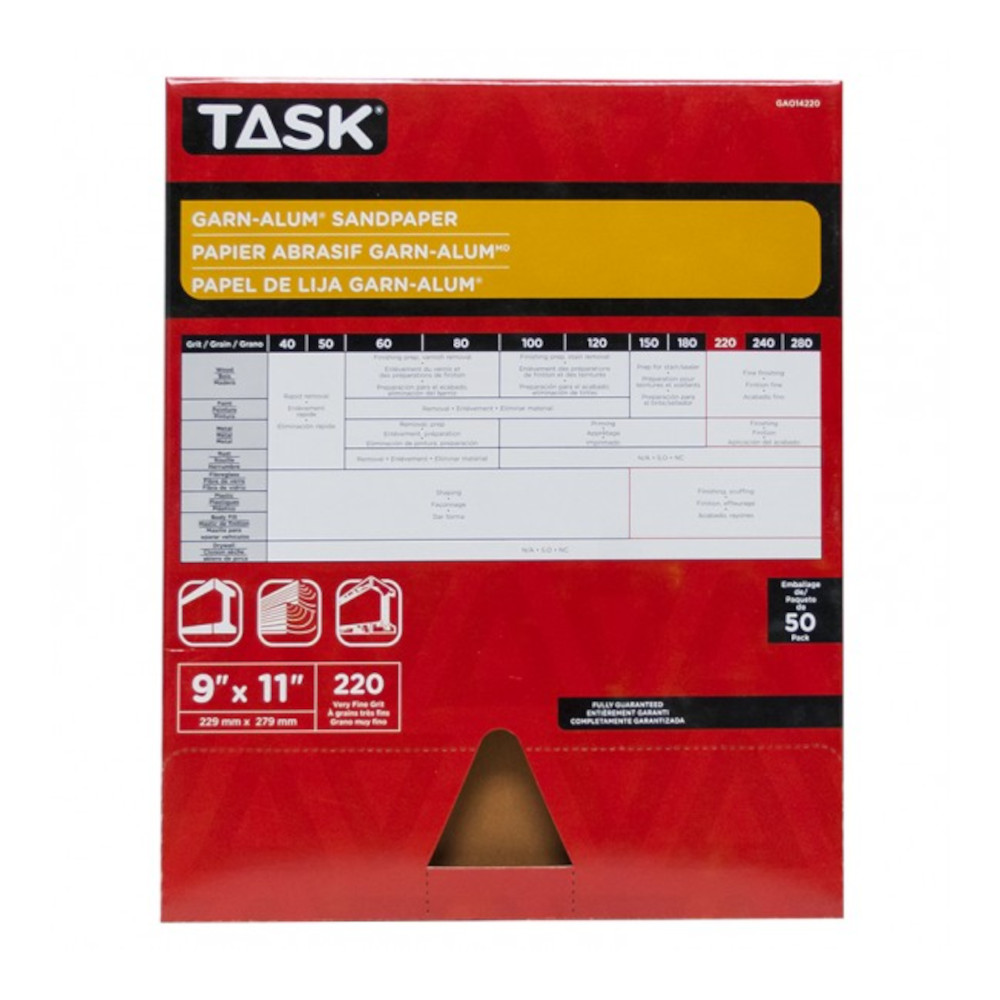 Task Garn-Alum Sandpaper, Coat Type: Closed, 11 in L, 9 in W, 220 Grit, Kraft Paper Backing, Backing Weight: C, Grit Grade: Very Fine, Aluminum Oxide Abrasive, Applicable Materials: Wood