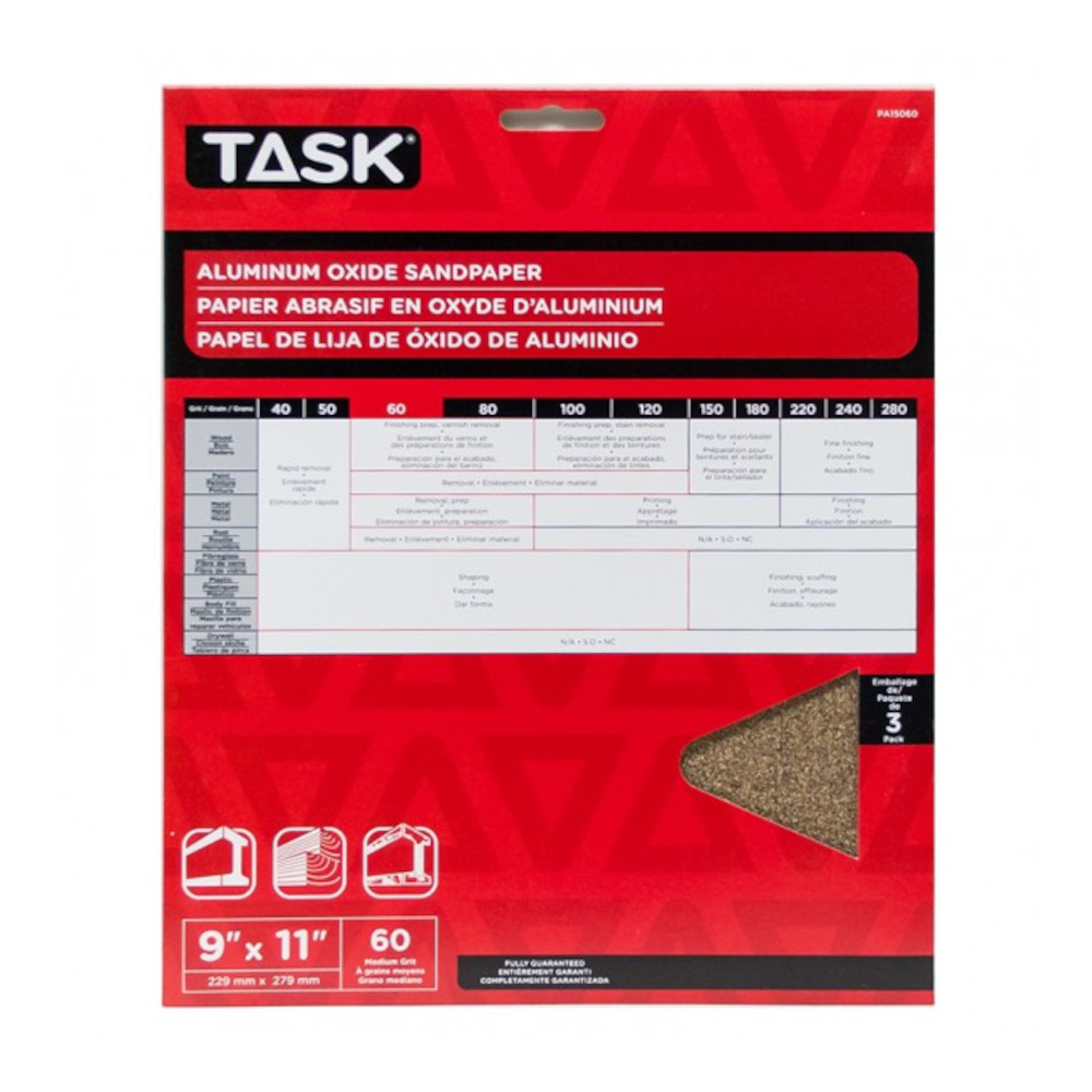 Task PA15060 11" x 9" 60 Grit Medium Premium Sandpaper, 3 Pack