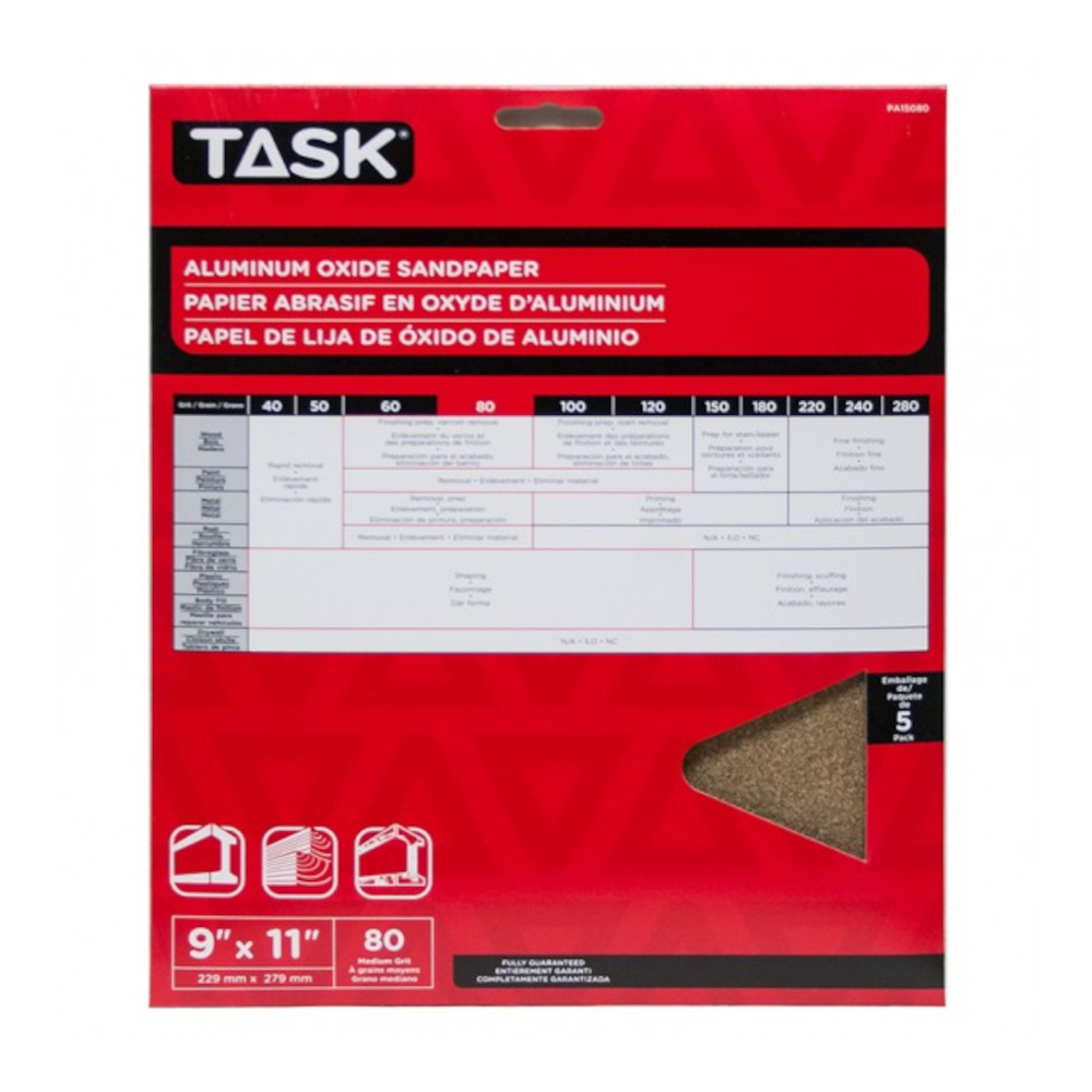 Task PA15080 11" x 9" 80 Grit Medium Premium Sandpaper, 5 Pack