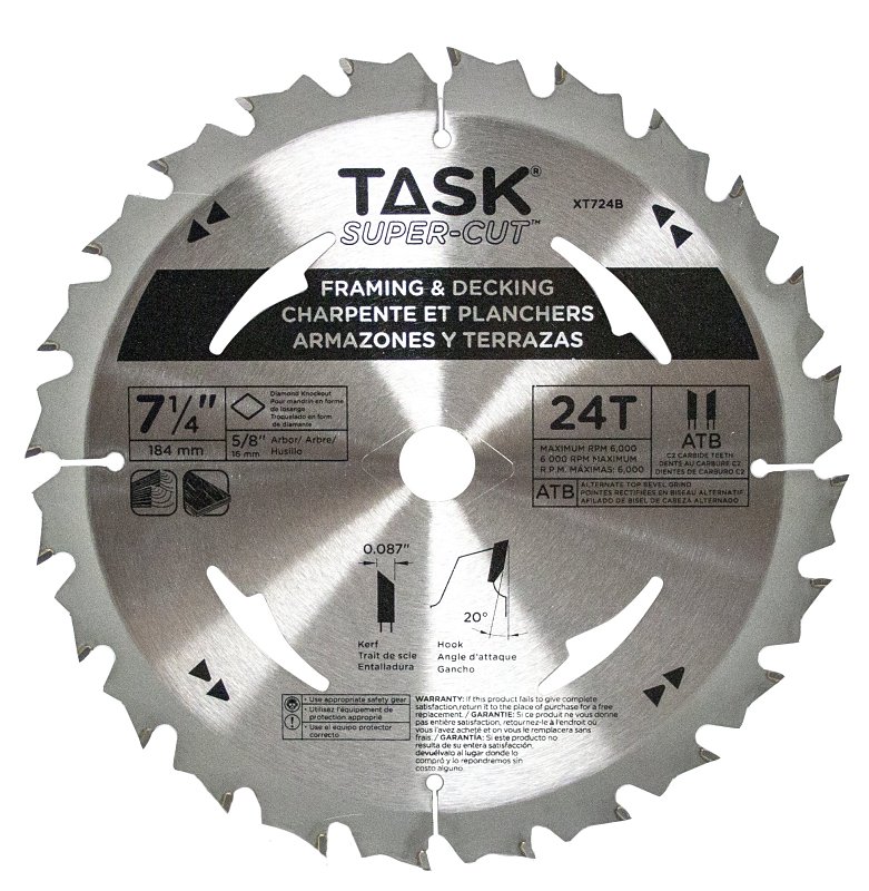 Task Supercut Framing and Decking Saw Blade, 7-1/4 in Dia, Cutting Edge Material: Tungsten Carbide, Teeth Type: ATB, Number of Teeth: 24, Arbor Size: 5/8 in, 6000 rpm, Hook Angle: 20 deg, Kerf: 0.087 in, Applicable Materials: Plywood