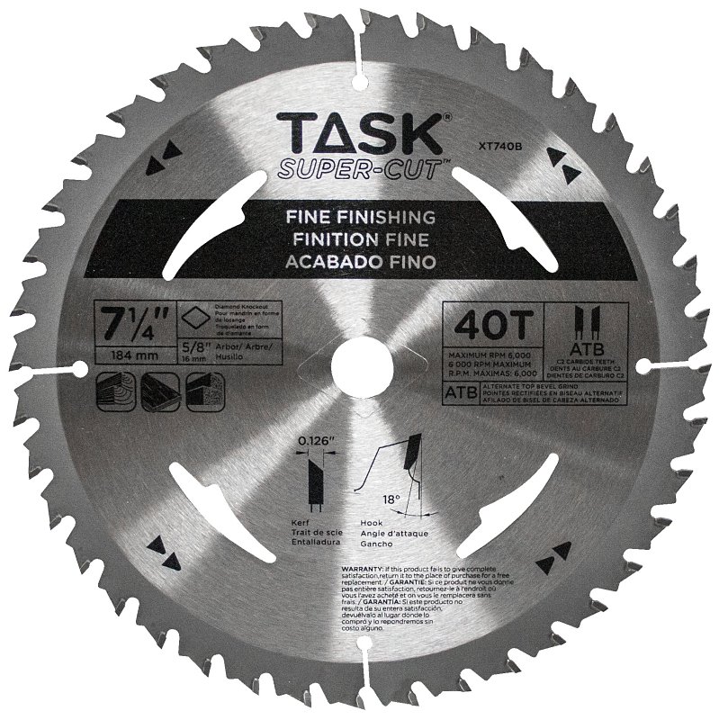 Task Supercut Finishing Saw Blade, 7-1/4 in Dia, Cutting Edge Material: Tungsten Carbide, Teeth Type: ATB, Number of Teeth: 40, Arbor Size: 5/8 in, 6000 rpm, Hook Angle: 18 deg, Kerf: 0.126 in, Applicable Materials: Plywood