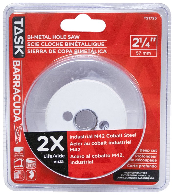 Task Hole Saw, Deep Cut, Cutting Depth: 1-7/8 in, 2-1/4 in Dia, Cutting Edge Material: Carbon Steel, Body Material: Bi-Metal, Applicable Materials: Aluminum, Brass, Iron, Plastic, Stainless Steel, Steel, Wood