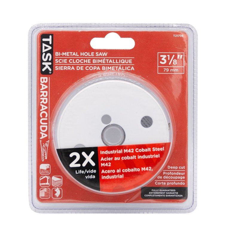Task Hole Saw, Deep Cut, 3-1/8 in Dia, Cutting Edge Material: Bi-Metal, Body Material: Bi-Metal, Applicable Materials: Aluminum, Brass, Composite Board, Cast Iron, Plastic, Stainless Steel, Steel, Wood