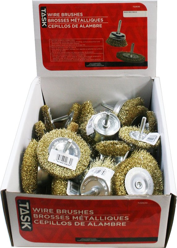 Task Wire Wheel and Cup Brush Kit, Arbor/Shank Size: 1/4 in, Steel Bristle, Applicable Materials: Metal, Wood, Includes: (4) T25614, (2) T25615, (4) T25616, (2) T25617 Steel Crimp Wire Wheels, (8) T25625, (2) T25626, (6) T25627, (2) T25628 Steel Wire Crimp Cups
