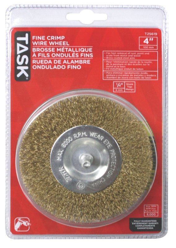 Task Wire Wheel, Arbor/Shank Size: 1/4 in, Bristle Type: Crimped, Bristle Diameter: 4 in, 6000 rpm, Steel Abrasive, Grit Grade: Fine, Applicable Materials: Metal, Wood