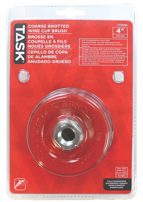 Task T25686 Wire Cup Brush, 4 in Dia, 5/8-11 in Arbor/Shank, Knotted Bristle, Steel Bristle
