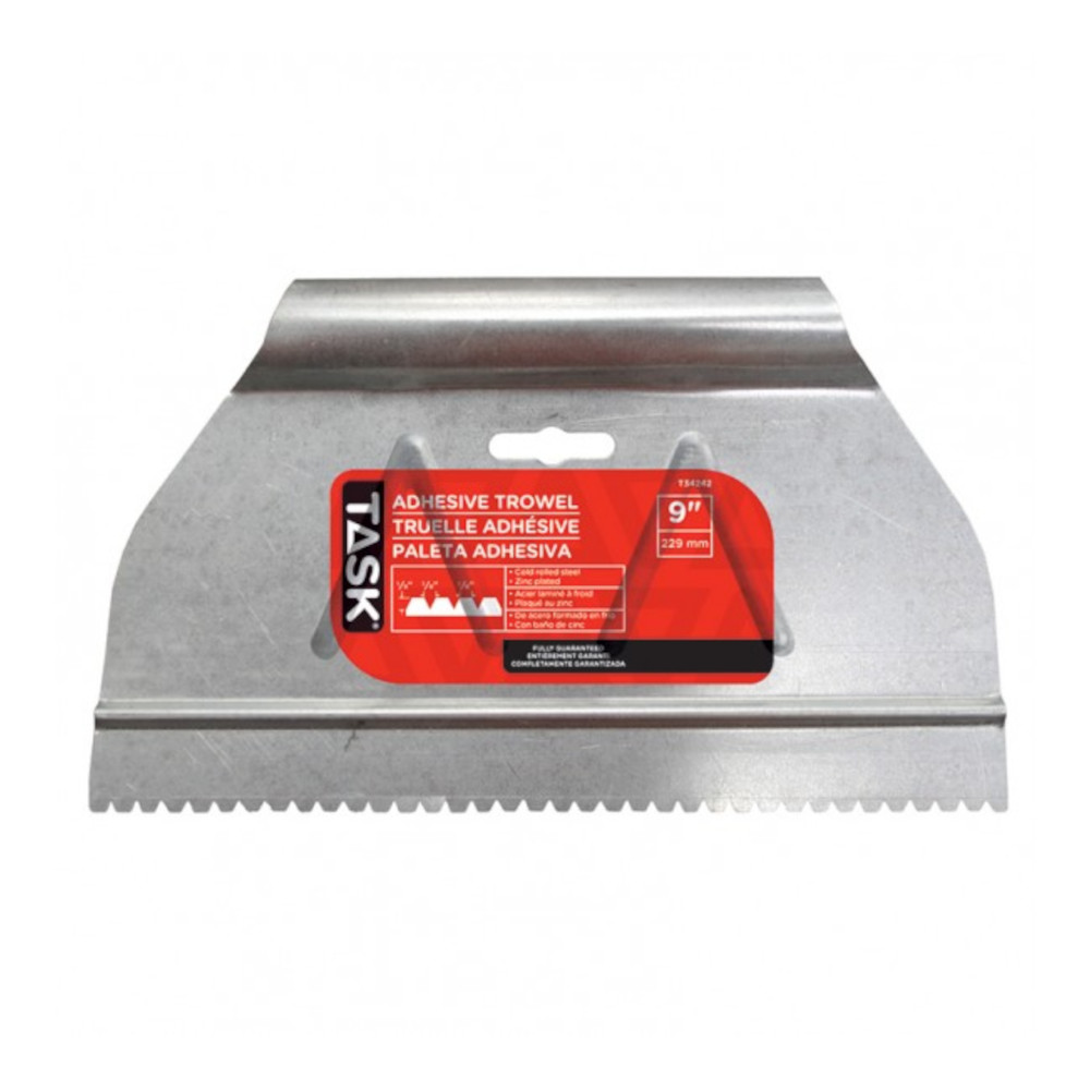 Task Adhesive Spreader, Steel Blade, 9 in L Blade, Zinc Blade, Notch Shape: V, Notch Size: 1/8 x 1/8 x 1/8 in