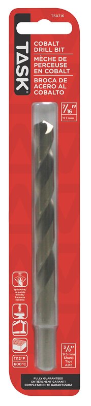 Task Drill Bit, 7/16 in Dia, Shank Type: Reduced, Shank Diameter: 3/8 in, Point Type: Split, Point Angle: 135 deg, Cobalt, Applicable Materials: Abrasive Materials, Hardened Tool Steel, Stainless Steel, Steel