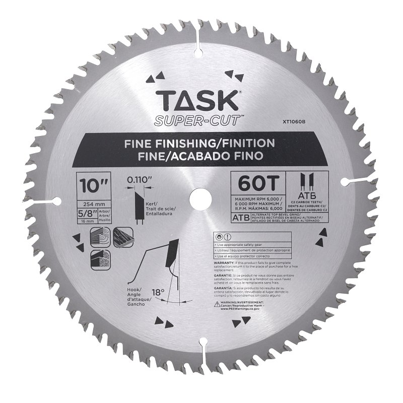 Task Circular Saw Blade, 10 in Dia, Cutting Edge Material: Tungsten Carbide, Number of Teeth: 60, Arbor Size: 5/8 in, 6000 rpm, Kerf: 0.11 in