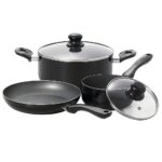 Pressed aluminum. Oven-safe up to 350 deg F/176 deg C. Dishwasher-safe. Set with Bakelite handles includes 1.45 qt open saucepan with lid, 4.8 qt with lid, 9-1/2 in open fry pan.