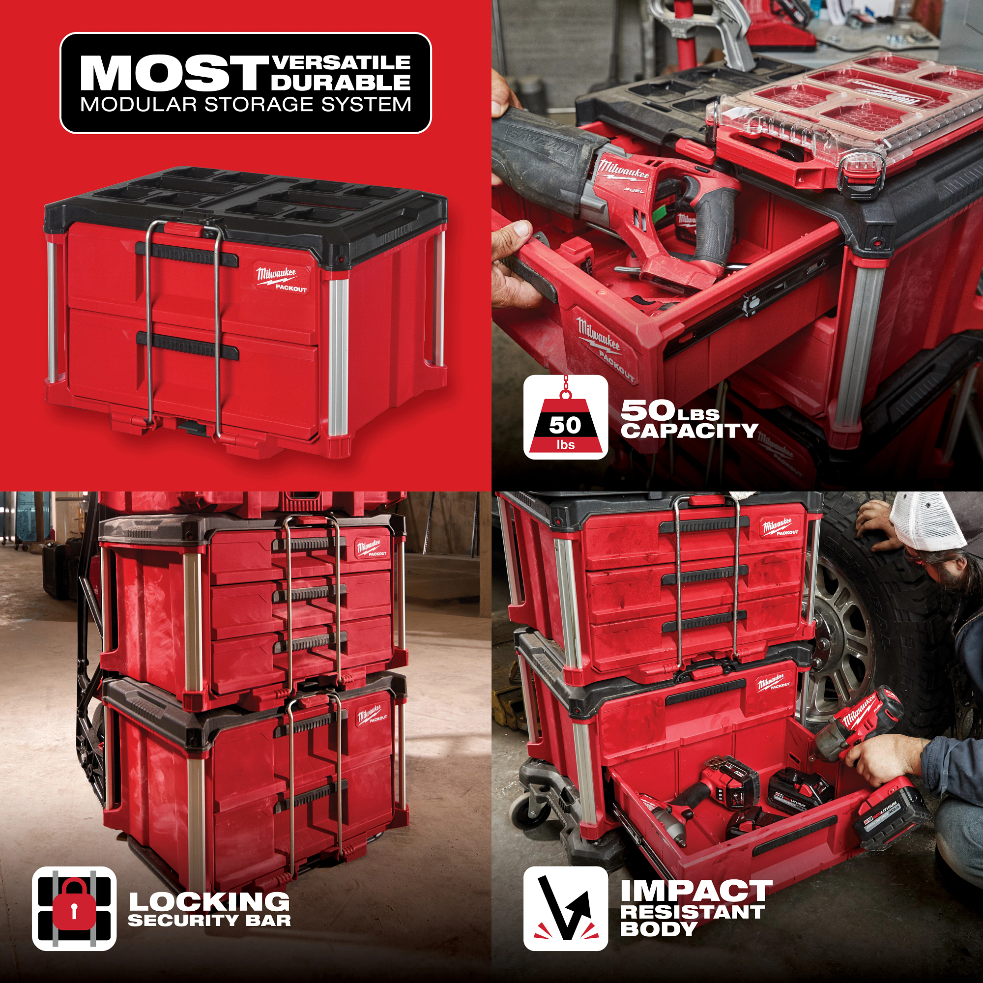 The MILWAUKEE® PACKOUTâ„¢ 2-Drawer Tool Box has a 50lbs weight capacity and a locking security bar to padlock the drawers closed keeping them securely shut during transport. As part of the PACKOUTâ„¢ Modular Storage, the toolbox provides customized storage solutions for easy transportation and organization of tools and accessories. This portable toolbox with drawers is constructed with impact-resistant polymers, all-metal ball bearing slides, and metal reinforced corners for ultimate jobsite durability. The 2-Drawer Tool Box has Quick-Adjust Dividers(includes 1 set of dividers) to customize the drawer layout. The PACKOUTâ„¢ Modular Storage System is the industry’s most versatile and durable storage system.