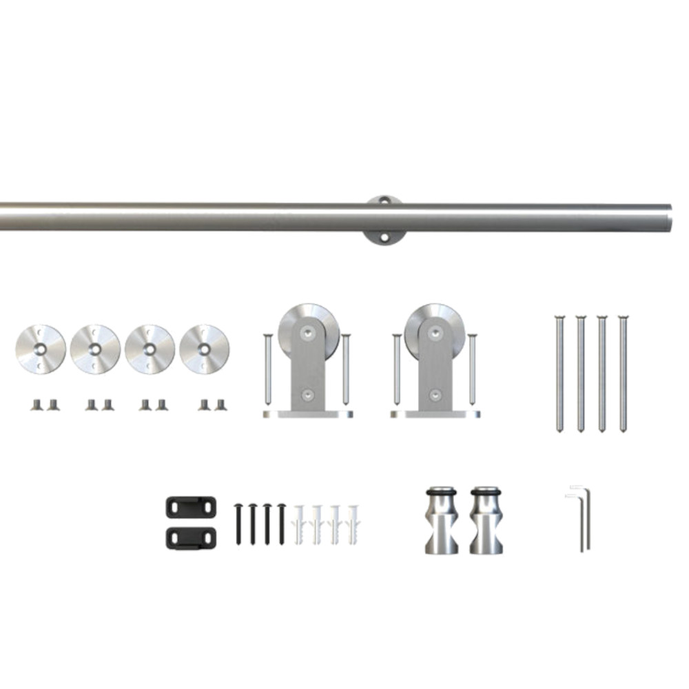 The industrial barn door style sliding door kit with 2.0 m upper track in stainless steel. The kit is made for door thickness of 35 to 45 mm. The lag bolt and pre-drilled track makes for a simple installation.