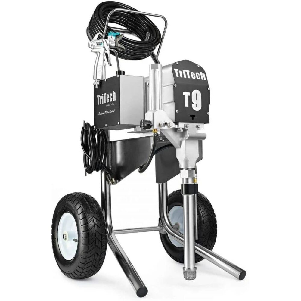 The TriTech T9 Airless Paint Sprayer is a high-performance tool designed for professional painters and serious DIY enthusiasts. This airless paint sprayer is engineered to deliver precise and efficient paint application, making it ideal for large projects, including walls, ceilings, and exteriors. The T9 model is known for its durability and robust construction, ensuring long-lasting performance even under demanding conditions. Featuring advanced airless technology, the TriTech T9 provides a consistent and even spray pattern, reducing overspray and ensuring a smooth, high-quality finish. The powerful motor allows for the efficient spraying of a wide range of coatings, from thin stains to thick latex paints. The ergonomic design and lightweight construction make it easy to handle, reducing user fatigue during extended use. The TriTech T9 Airless Paint Sprayer also includes user-friendly controls for easy operation and quick adjustments, allowing for precise control over spray pressure and pattern. This makes it an excellent choice for both residential and commercial painting projects, offering professional results with ease.