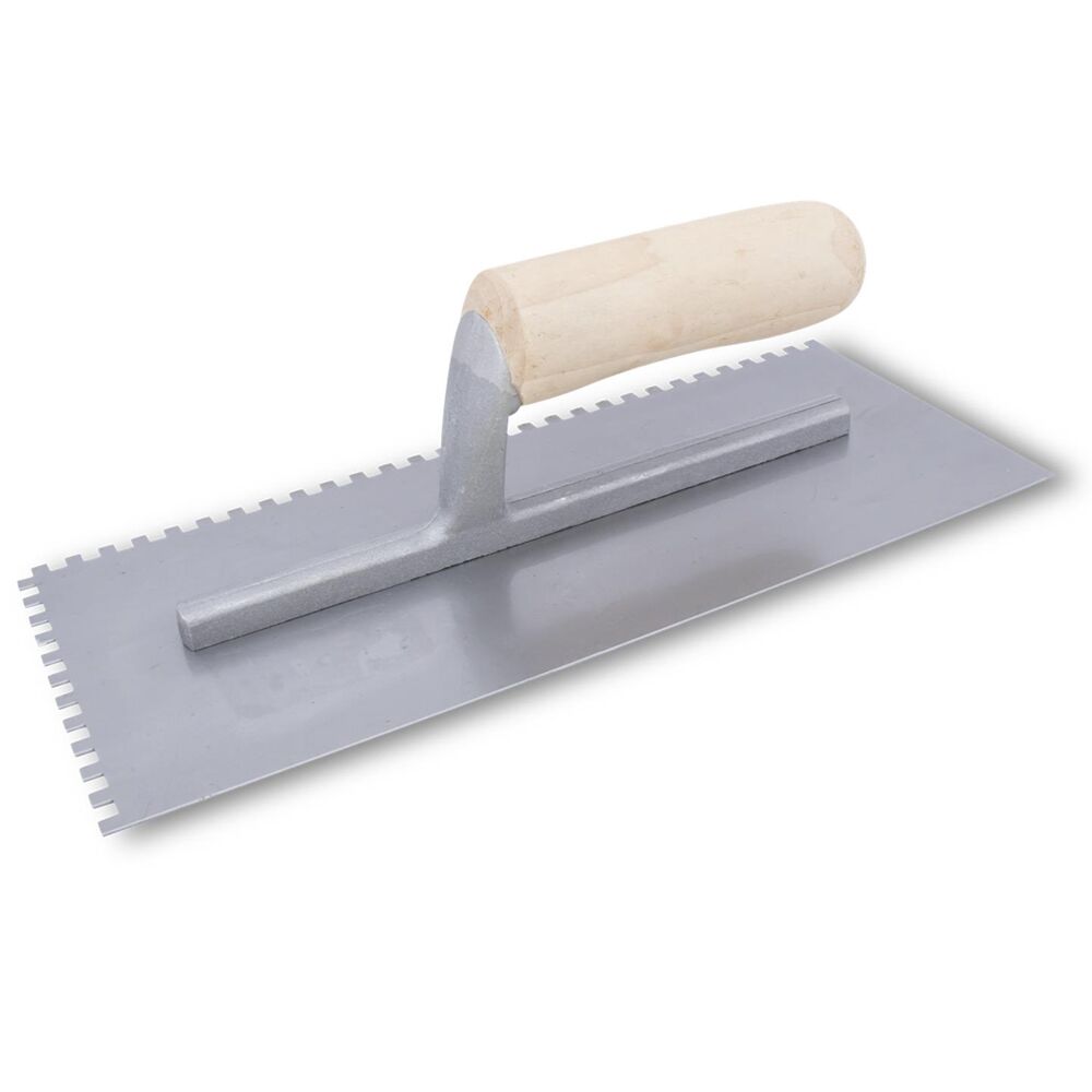 The Notched Trowels are the best Tile Trowel for any professional tiler. These versatile Notched Trowels can be used to complete any and all types of tiling, from floors, walls, or a kitchen backsplash to the most intricate mosaic work. Each of our 11” x 4 ½” Notched Trowels have an aluminum alloy mounting riveted to a hard tempered steel blade that is flexible yet durable.