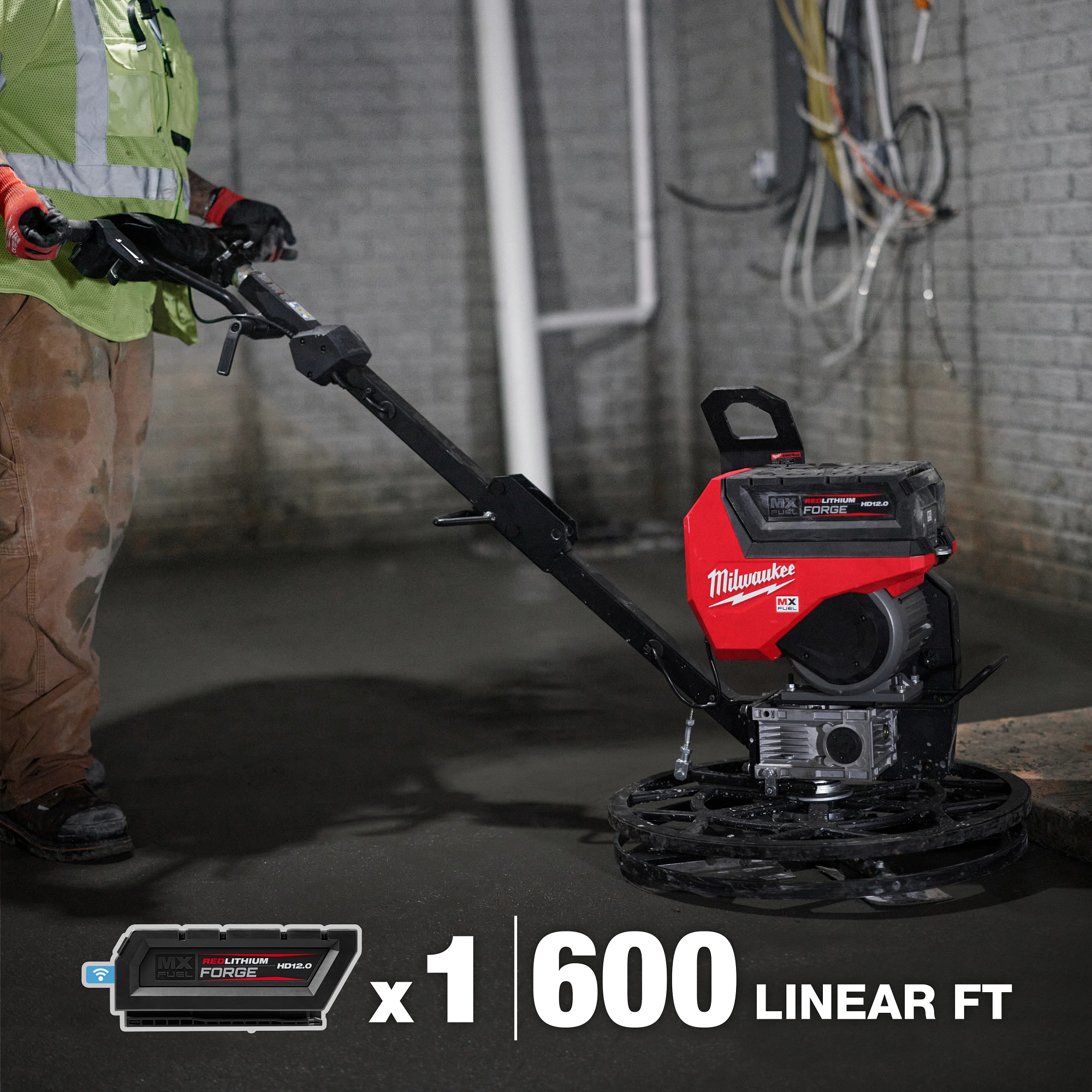 The MILWAUKEE® MX FUEL™ 24” Walk- Behind Edging Trowel provides a smooth, balanced finishing experience with 5HP performance, no gas headaches, and 35 min of runtime per charge. The POWERSTATE™ Brushless Motor delivers 5HP performance and unmatched control with a max blade speed of 160 RPM and an ergonomic throttle design. The edging trowel provides instant power with no gas headaches and requires no regular maintenance, producing less noise and zero emissions for a safer workspace indoors or outdoors. The MX FUEL™ 24” Walk- Behind Edging Trowel is kitted with (2) MX FUEL™ REDLITHIUM™ FORGE™ HD12.0 batteries & a Super Charger. In just 65 minutes, you can charge an MX FUEL™ REDLITHIUM™ FORGE™ HD12.0 to 100%. Both the MX FUEL™ REDLITHIUM™ FORGE™ HD12.0 Battery & MX FUEL™ Super Charger are COOL-CYCLE™ Capable. COOL-CYCLE™ Active Cooling System, provides high-speed cooling for less downtime. The active cooling feature works with M18™ batteries that have COOL-CYCLE™ capability. REDLINK PLUS™ Intelligence ensures optimal performance and provides overload protection to protect your machine and battery during the toughest applications. The MILWAUKEE® MX FUEL™ 24” Walk-Behind Edging Trowel is ONE-KEY™ Compatible. You can track, manage and secure your equipment from your mobile device or computer using the industry’s largest Bluetooth® community tracking network. If your power trowel is ever lost or stolen, you can prevent tampering with remote lockout capability.