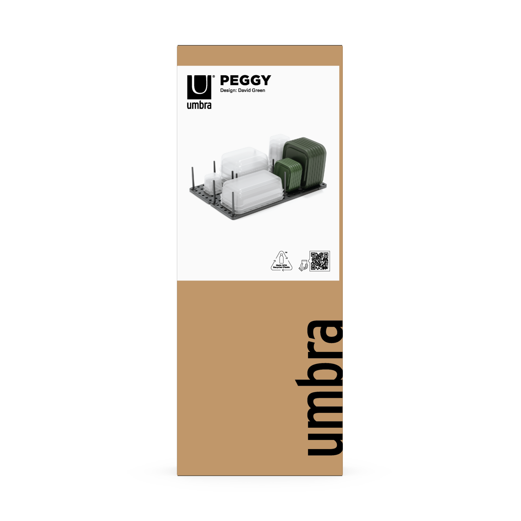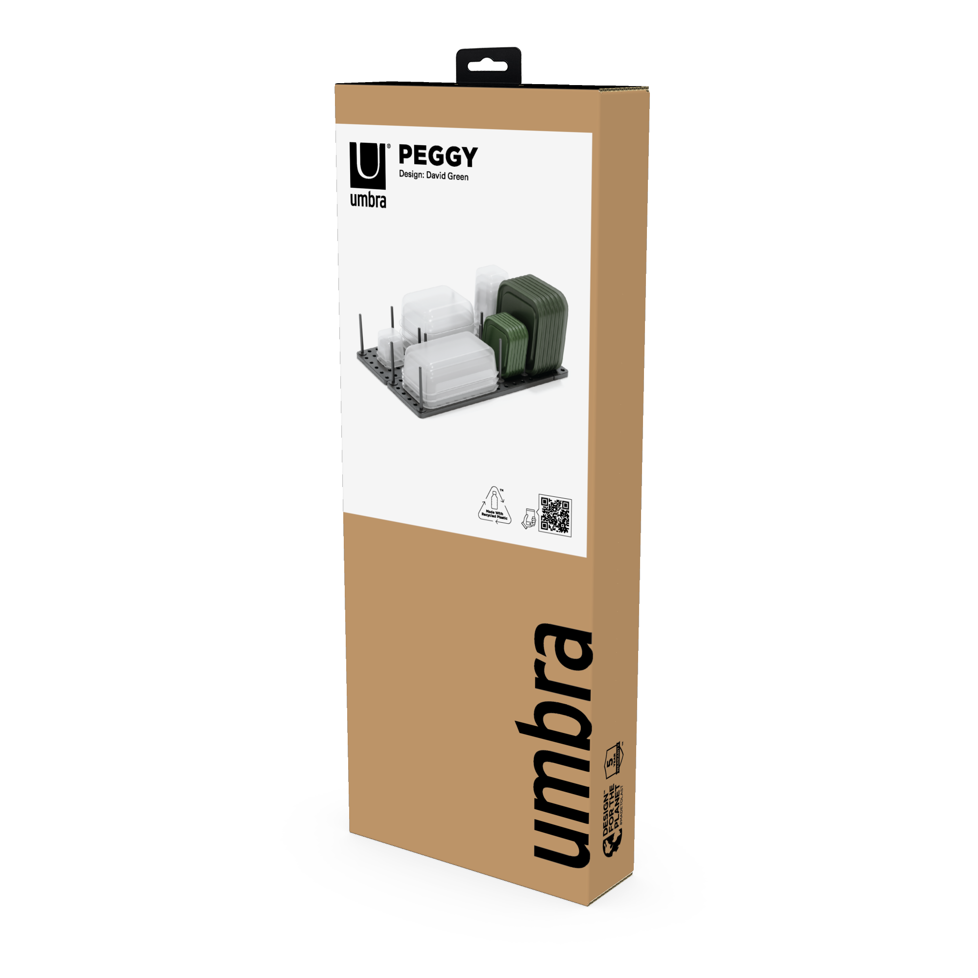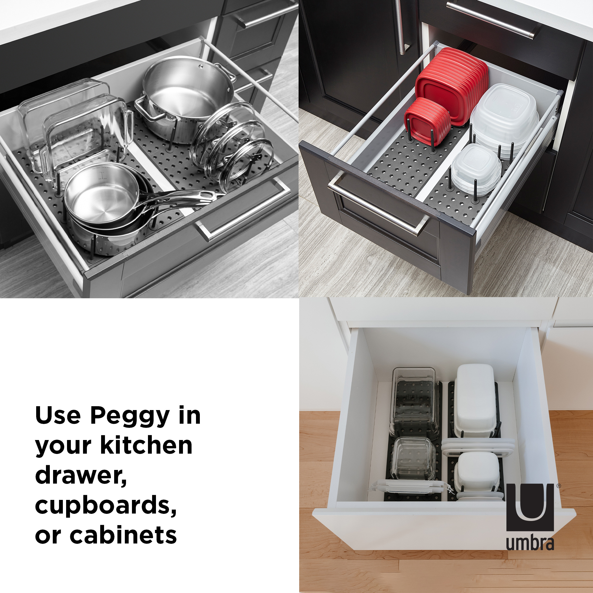 What makes Peggy unique is the adjustable tray and removable pegs that can be repositioned at any time. You choose where to place them based on your needs which means you can create the perfect fit to accommodate your plastic food storage containers and lids, your cookware including pots, pans and lids, your mixing bowls, your cooking utensils and just about anything else you want to keep organized and in its place. With a matrix of 108 holes and a total of 32 pegs included, there’s literally hundreds of available configurations which means nearly limitless storage possibilities. To ensure a perfect fit, each base can be extended up to an additional 3.25 inches and comes equipped with non-slip feet to ensure Peggy stays put. Measures 21.5 x 6 x 4 inches (55 x 15 x 10 cm). Made with recycled plastics.