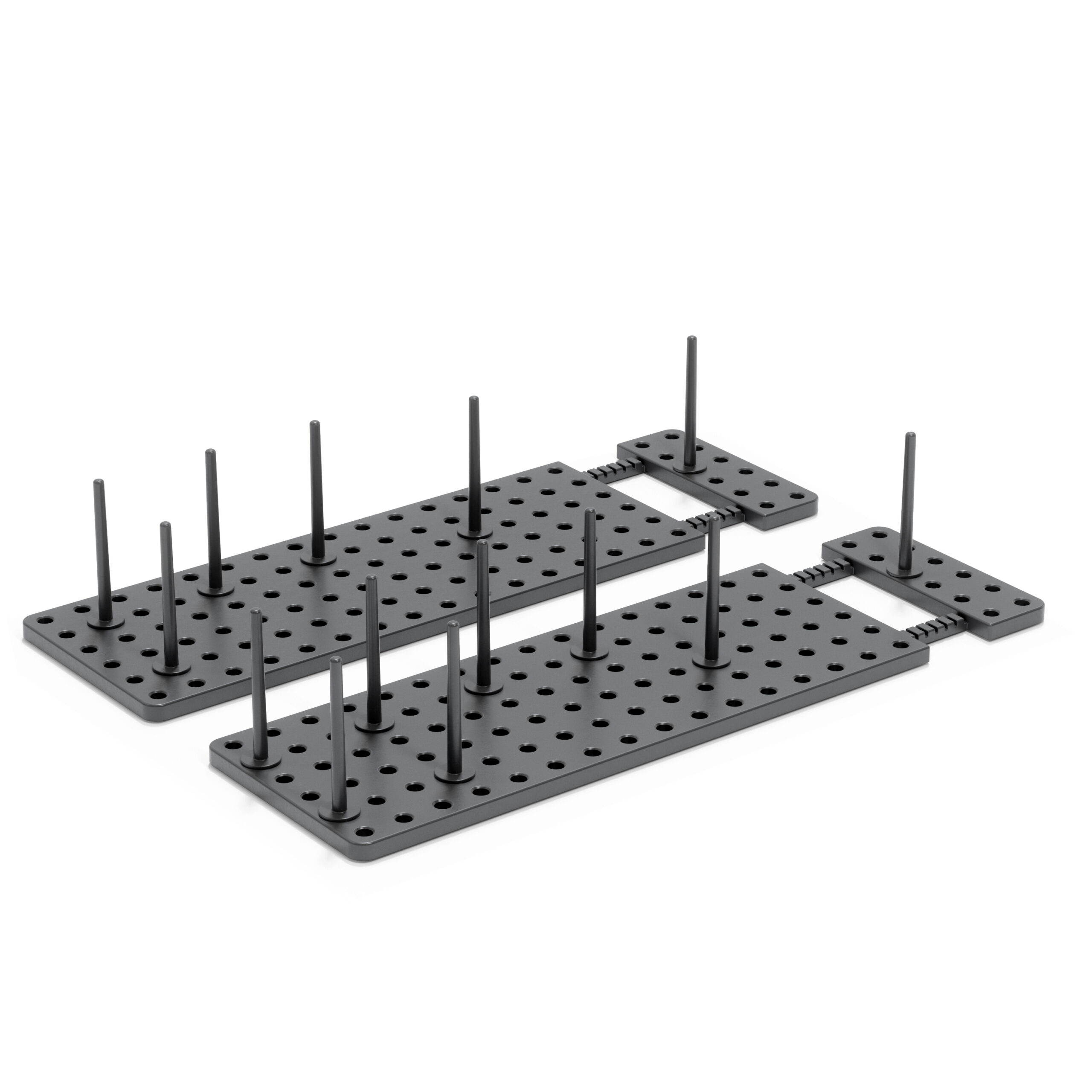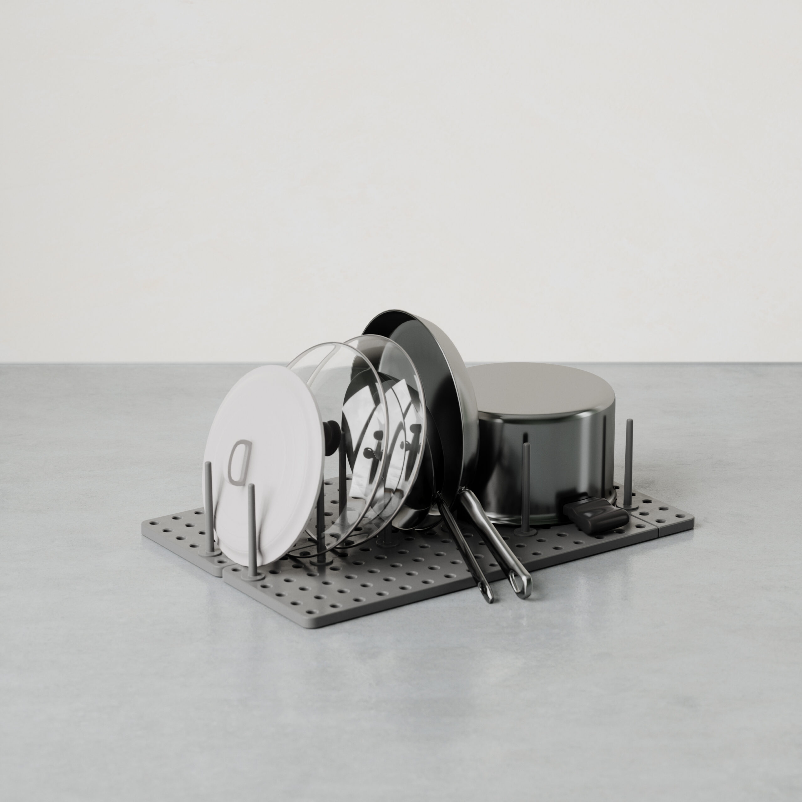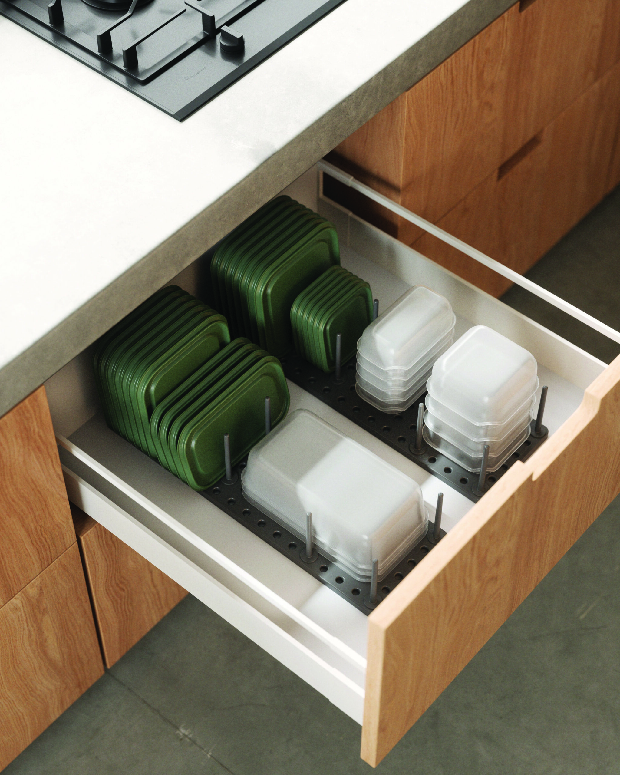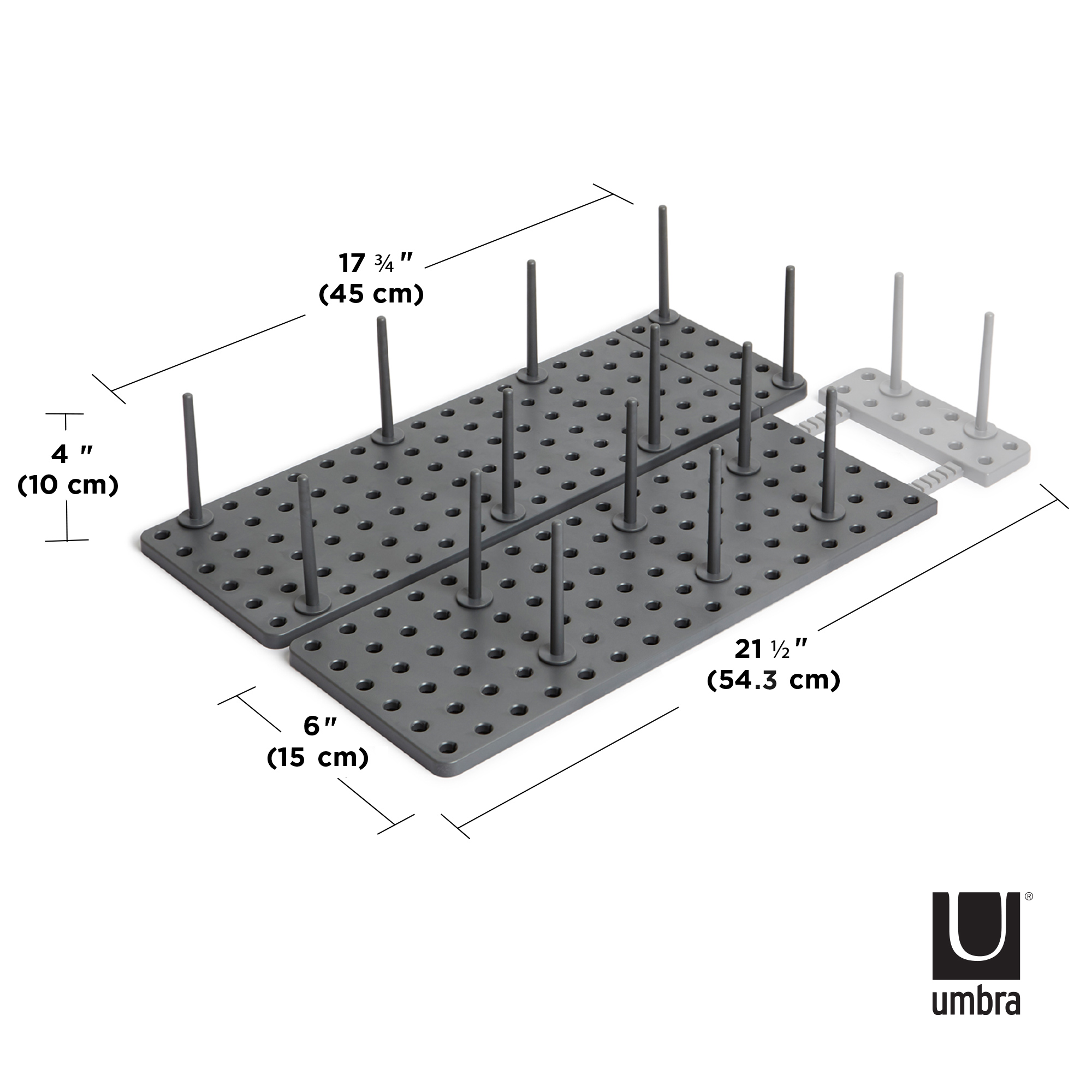 What makes Peggy unique is the adjustable tray and removable pegs that can be repositioned at any time. You choose where to place them based on your needs which means you can create the perfect fit to accommodate your plastic food storage containers and lids, your cookware including pots, pans and lids, your mixing bowls, your cooking utensils and just about anything else you want to keep organized and in its place. With a matrix of 108 holes and a total of 32 pegs included, there’s literally hundreds of available configurations which means nearly limitless storage possibilities. To ensure a perfect fit, each base can be extended up to an additional 3.25 inches and comes equipped with non-slip feet to ensure Peggy stays put. Measures 21.5 x 6 x 4 inches (55 x 15 x 10 cm). Made with recycled plastics.