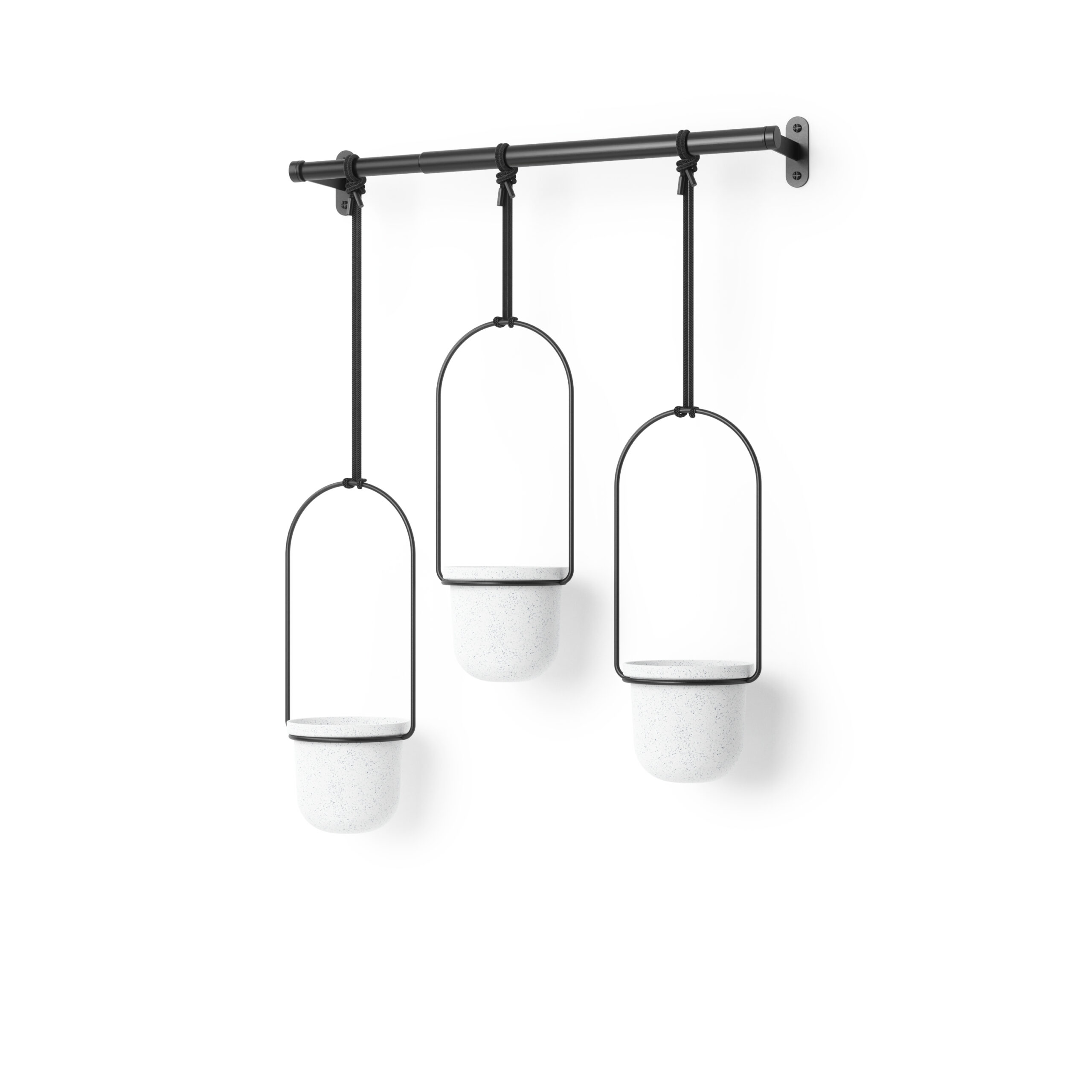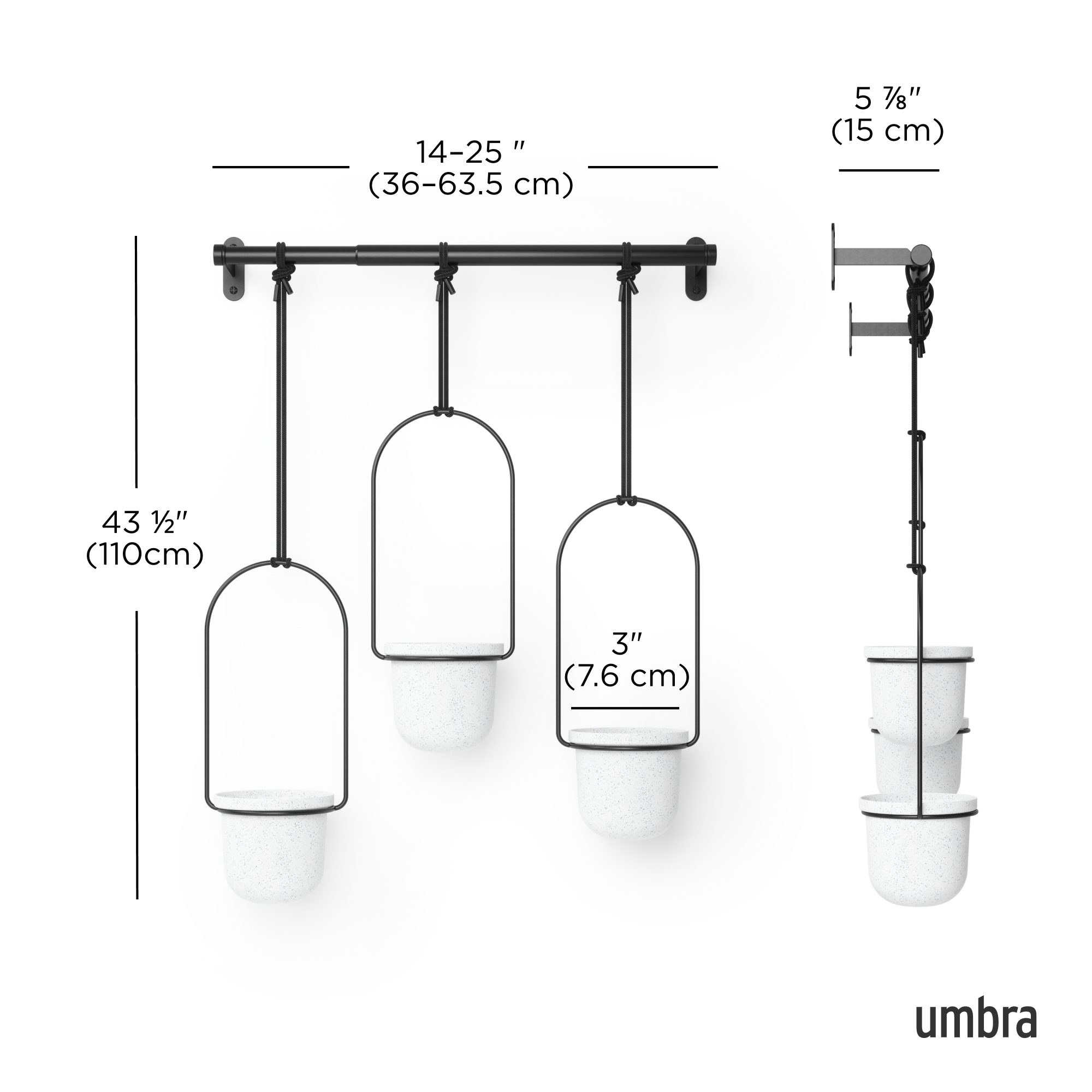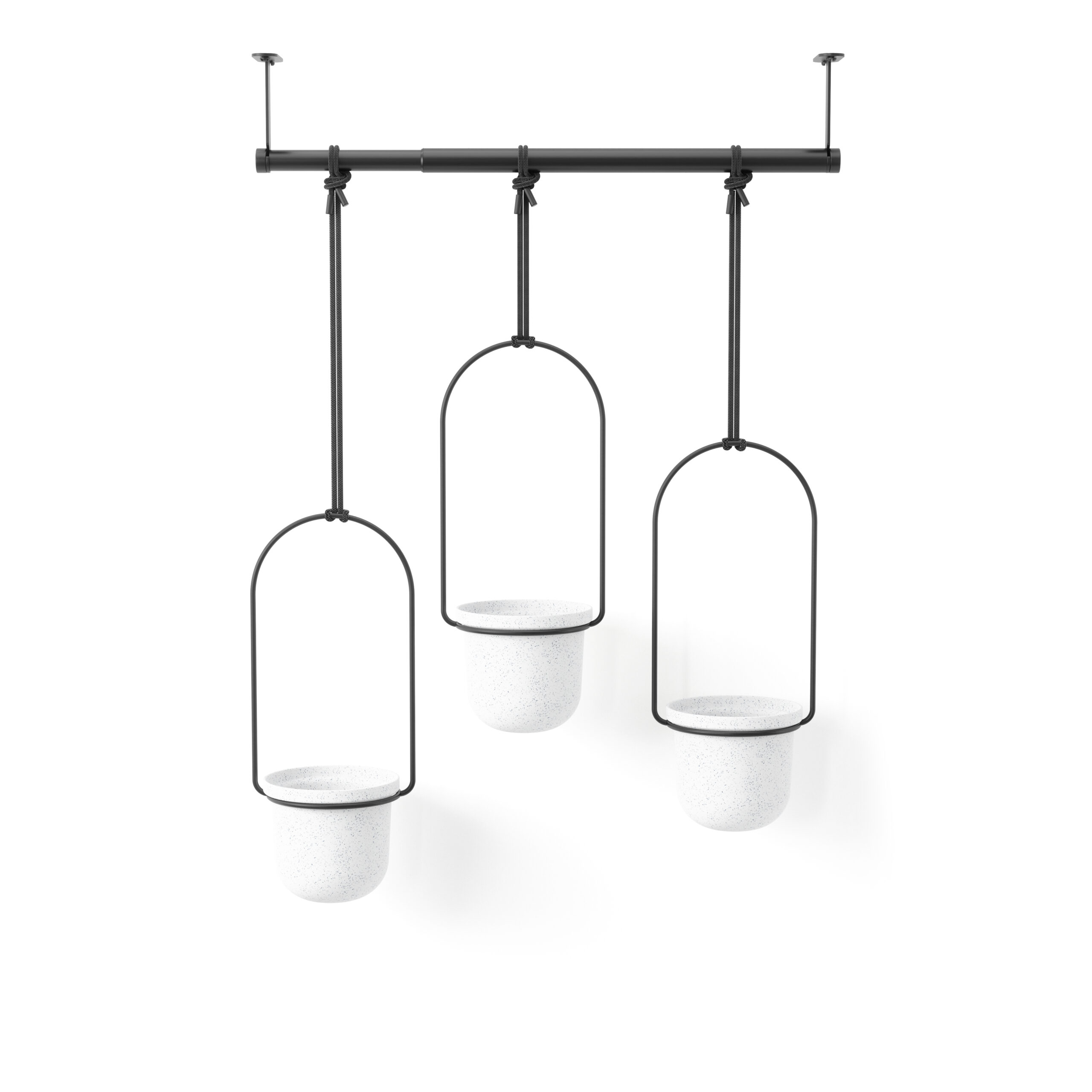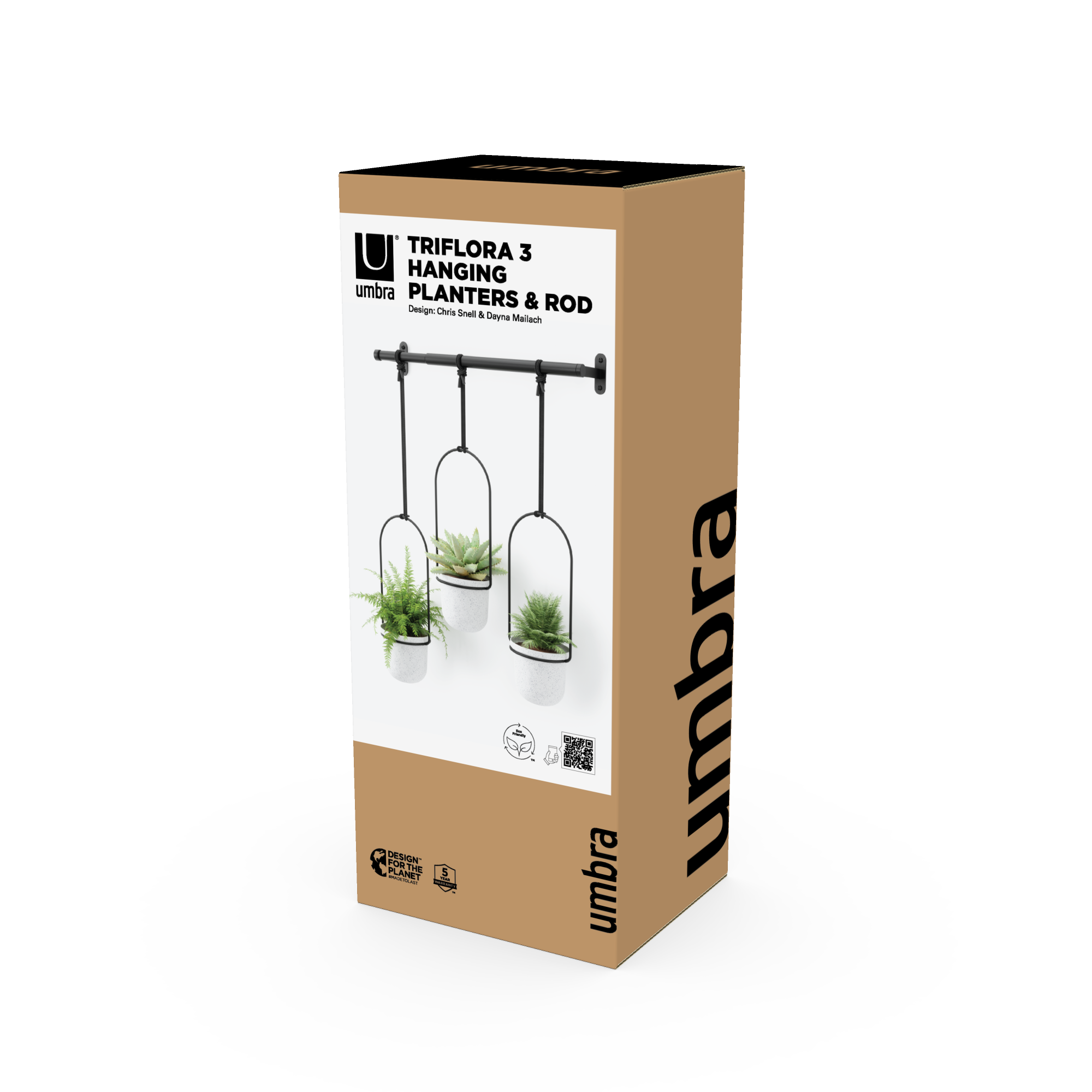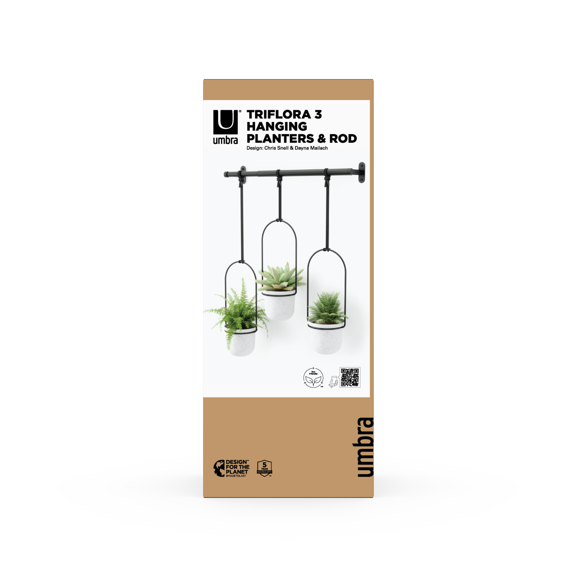 Introducing Triflora, the ultimate indoor hanging planter! It combines the practicality of a drapery rod with the beauty of potted plants. Perfect for herbs, succulents, and vine plants, Triflora hangs on your wall or ceiling and transforms your window into a green oasis. But what makes Triflora truly special is its lightweight design. Made from durable recycled molded polypropylene, it stays light even with plants inside. Plus, you can easily adjust the length of its ropes and slide them anywhere along the metal rod to create your desired plant arrangement. No need to worry about repotting either. Triflora’s pots can hold standard 3-inch (7.6 cm) diameter pots, making it super convenient. And don’t be fooled by its lightness, Triflora can handle a maximum weight of 15lbs (6.8kg). Want to take your plants outside? No problem! Triflora is suitable for outdoor use too. And if you need drainage, simply drill a small hole in the bottom of each pot. Upgrade your space with Triflora and bring style and functionality to your indoor gardening game! Fits any standard 24-inch (61 cm) window, and can be ceiling or wall-mounted. This planter is made from durable lightweight recycled plastic with a recycled wood fibre, adding a natural texture to the surface. Measures 25 x 5.75 x 43.5 inches (64 x 15 x 110 cm). Made with recycled plastics.
