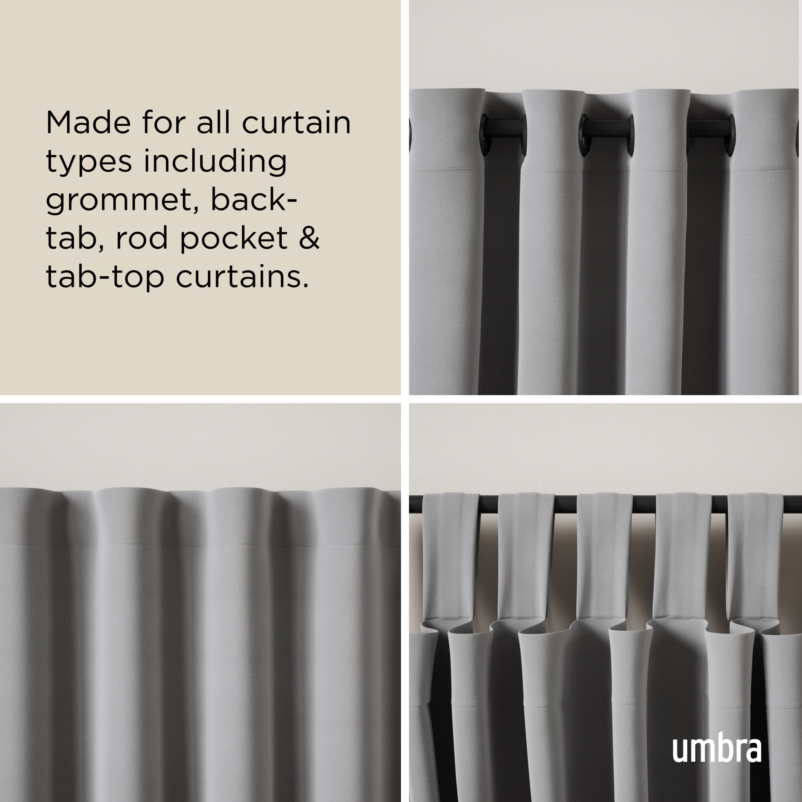 Each Cappa curtain rod from Umbra is made of high-quality materials and individually checked for quality assurance. Your Cappa Double Curtain Rod Set conveniently adjusts and gives you the flexibility to accommodate 1 or 2 curtain panel configurations depending on your needs. Cappa supports a variety of window fashions including light to medium weight curtains with a max weight of 22lbs. (10kg). Plus, everything you need to get it set up fast comes in the box including matching finials, adjustable wall-mounted curtain rod brackets, screws, drywall anchors and easy-to-follow installation instructions. This adjustable curtain rod works with a variety of decor styles and can be used with grommet, back-tab, rod pocket and tab-top curtains. Single rod brackets sit 4” (10 cm) from the wall , Double rod brackets sit 6” (15 cm) from the wall. This curtain rod is made with an eco-friendlier finish. It produces 85% less water and solid waste than traditional electroplating finishes. *Note: 1″ (2.5 cm) diameter rod includes a 3/4″ diameter back rod. 1.25″ (3.2 cm) diameter rod includes a 1″ (2.5 cm) diameter back rod. *36-66 Lengths include 2 brackets – all others include 3 brackets