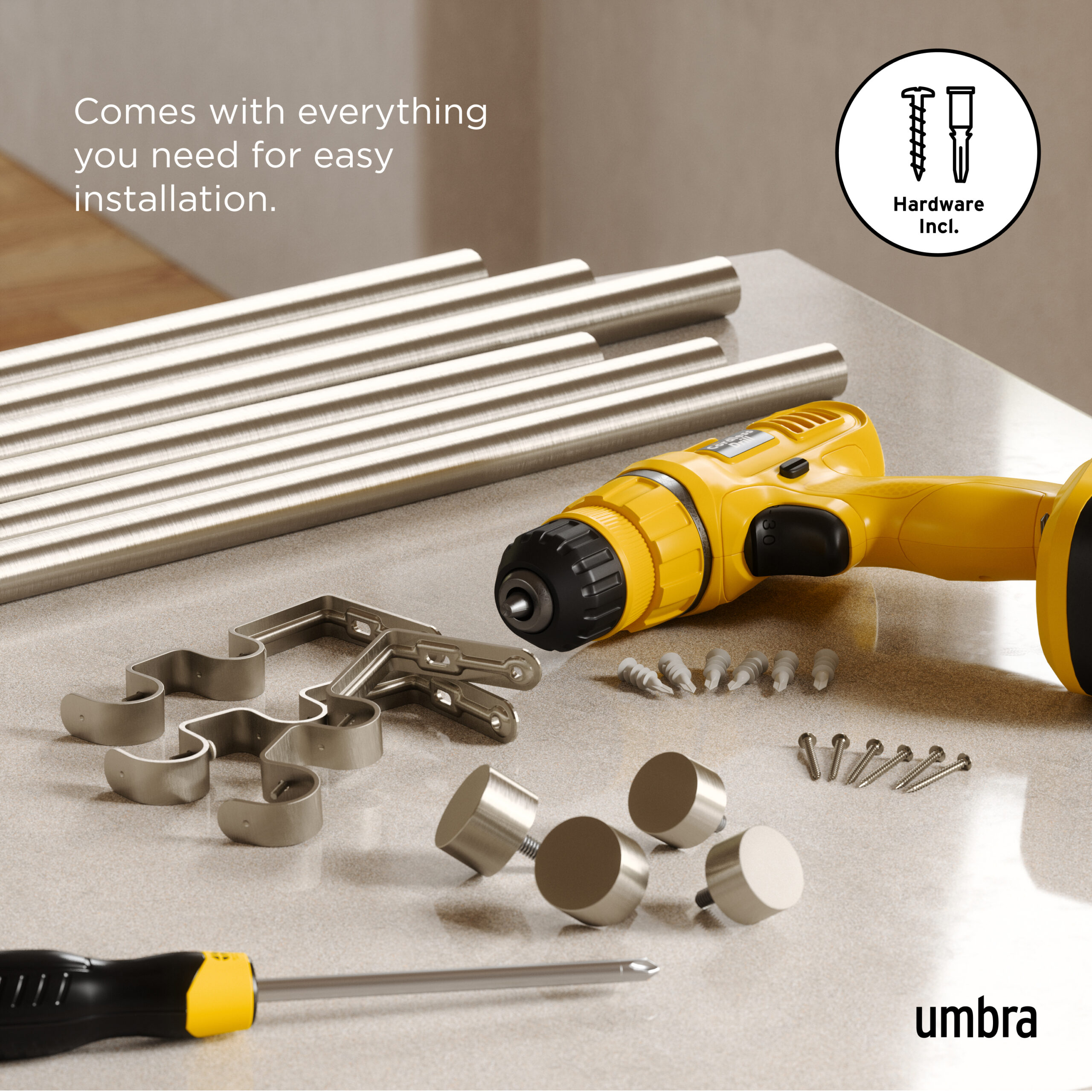 Each Cappa curtain rod from Umbra is made of high-quality materials and individually checked for quality assurance. Your Cappa Double Curtain Rod Set conveniently adjusts and gives you the flexibility to accommodate 1 or 2 curtain panel configurations depending on your needs. Cappa supports a variety of window fashions including light to medium weight curtains with a max weight of 22lbs. (10kg). Plus, everything you need to get it set up fast comes in the box including matching finials, adjustable wall-mounted curtain rod brackets, screws, drywall anchors and easy-to-follow installation instructions. This adjustable curtain rod works with a variety of decor styles and can be used with grommet, back-tab, rod pocket and tab-top curtains. Single rod brackets sit 4” (10 cm) from the wall , Double rod brackets sit 6” (15 cm) from the wall. This curtain rod is made with an eco-friendlier finish. It produces 85% less water and solid waste than traditional electroplating finishes. *Note: 1″ (2.5 cm) diameter rod includes a 3/4″ diameter back rod. 1.25″ (3.2 cm) diameter rod includes a 1″ (2.5 cm) diameter back rod. *36-66 Lengths include 2 brackets – all others include 3 brackets