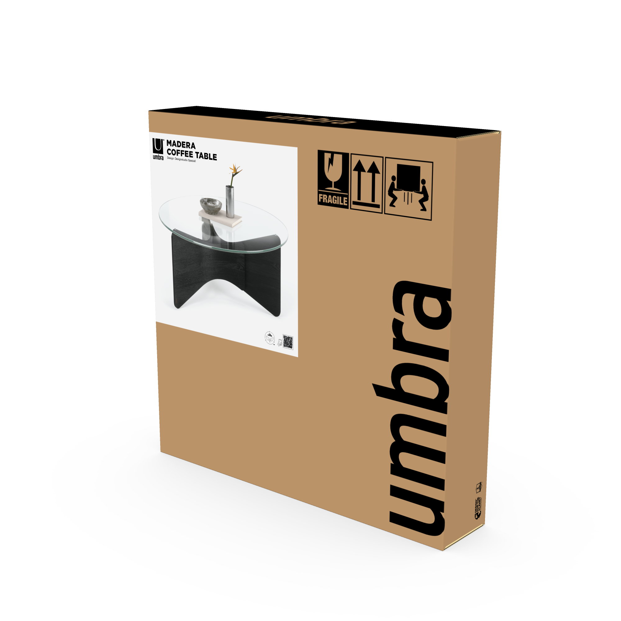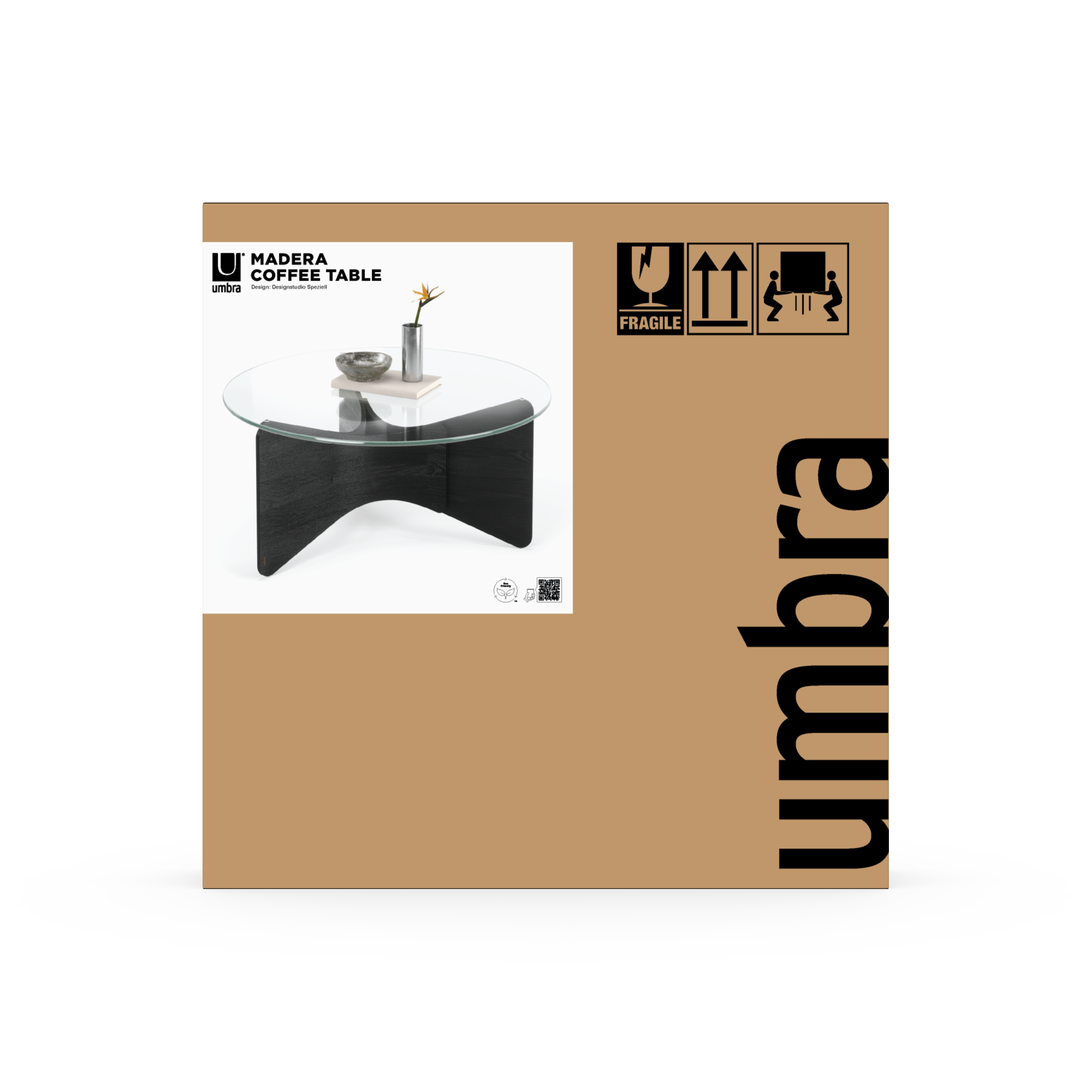 Experience sleek and sustainable furniture design with Umbra. This modern coffee table provides convenience and quality with its easy assembly and renewable wood construction — 80% of the wood comes from sustainable sources. The 10mm tempered glass top features polished edges making it easier to clean while providing a clear view of the intricately crafted base. With a 200lb. (91kg) weight capacity and scratch-resistant feet, Madera Coffee Table is built to last. Measures 33 x 33 x 14.85 inches (84 x 84 x 38 cm). Because wood is a natural finish, every Madera Coffee Table may slightly differ in grain. Wood is a unique natural material with variations in tone, texture, and grain. The product may vary from our imagery. Care:  wipe with a clean damp cloth