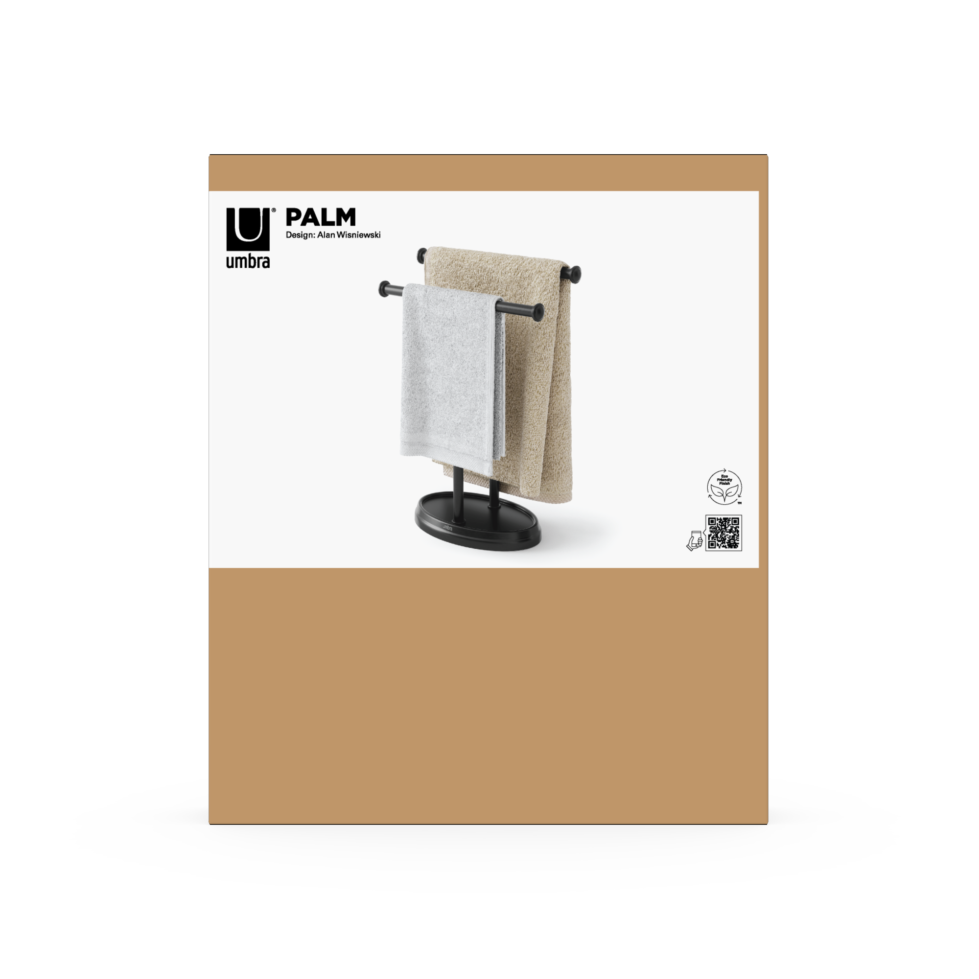 Palm Double Towel Tree keeps towels clean and orderly, and your countertop organized. The elegant towel stand is designed using strong metal, and a sleek nickel-finish. Its compact dimensions of 10.25 x 4.75 x 13.75 inches (26 x 12 x 35 cm) allow it to be easily stored on any surface. Fulfilling its intended purpose of holding 2 hand towels, Palm’s base can also be used as a tray for miscellaneous items. This towel tree is made with an eco-friendlier finish. It produces 85% less water and solid waste than traditional electroplating finishes.