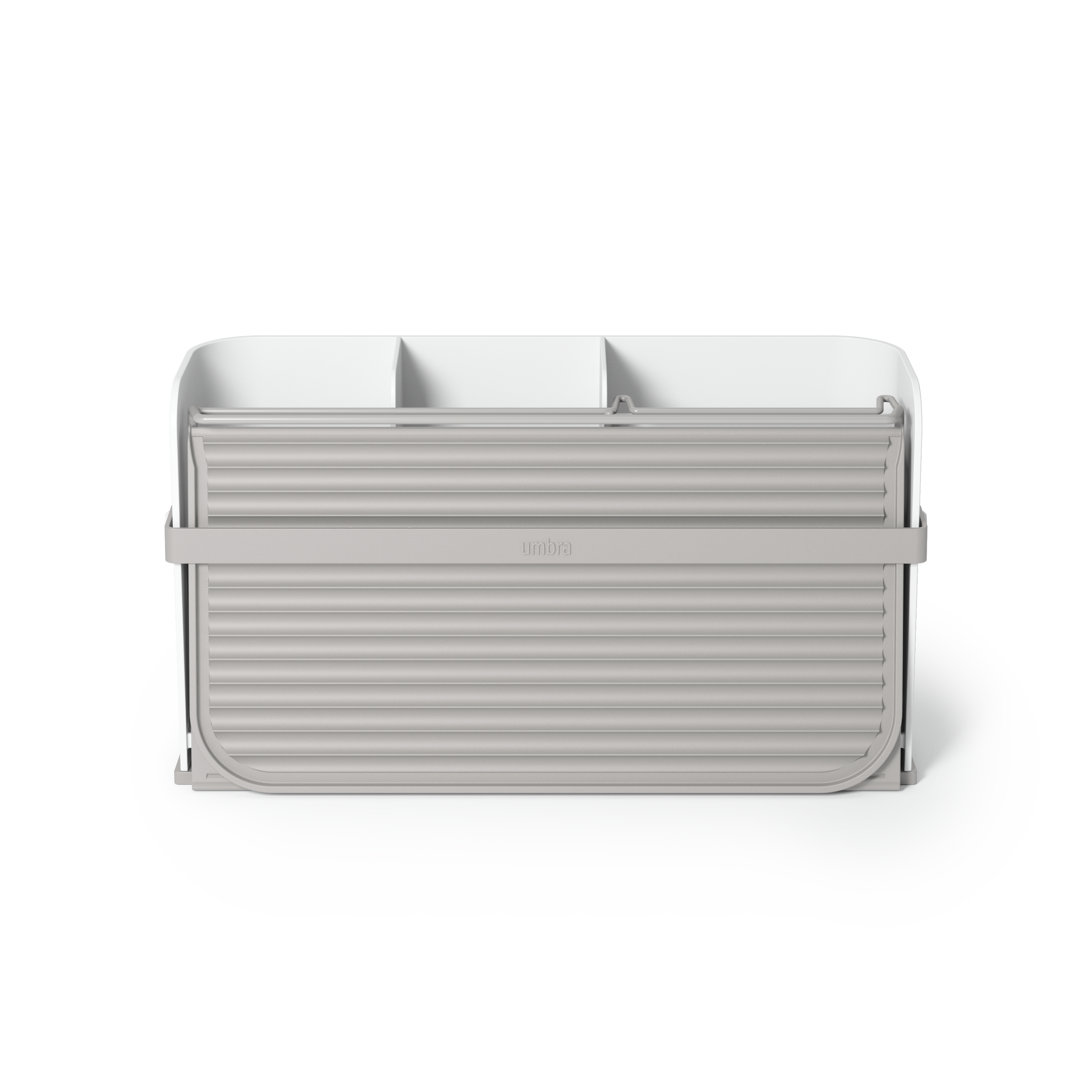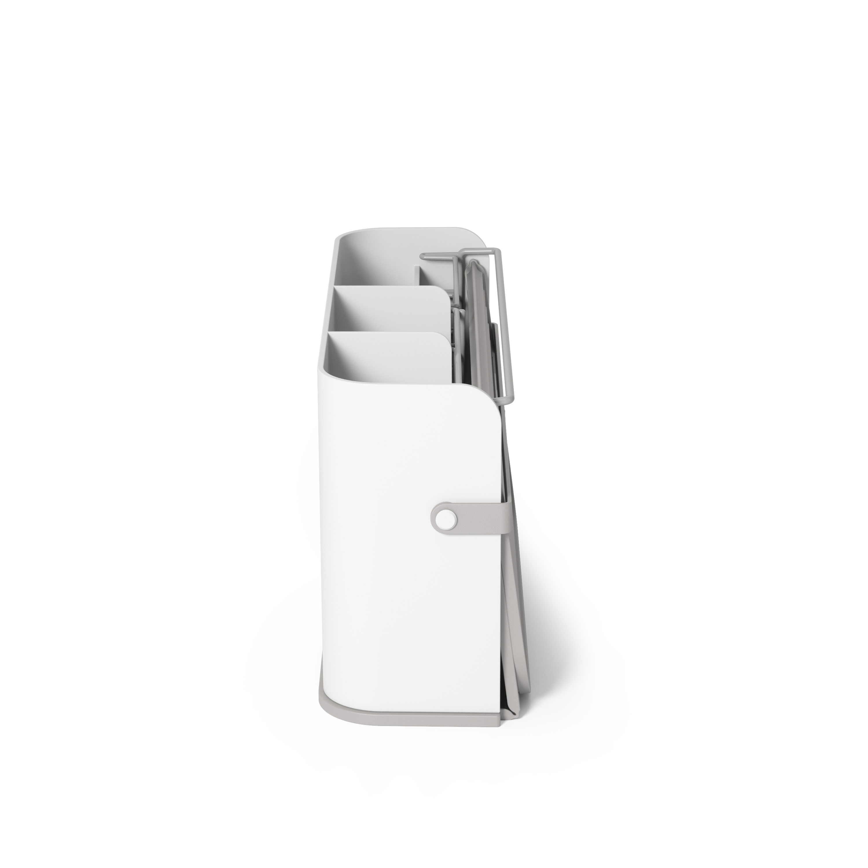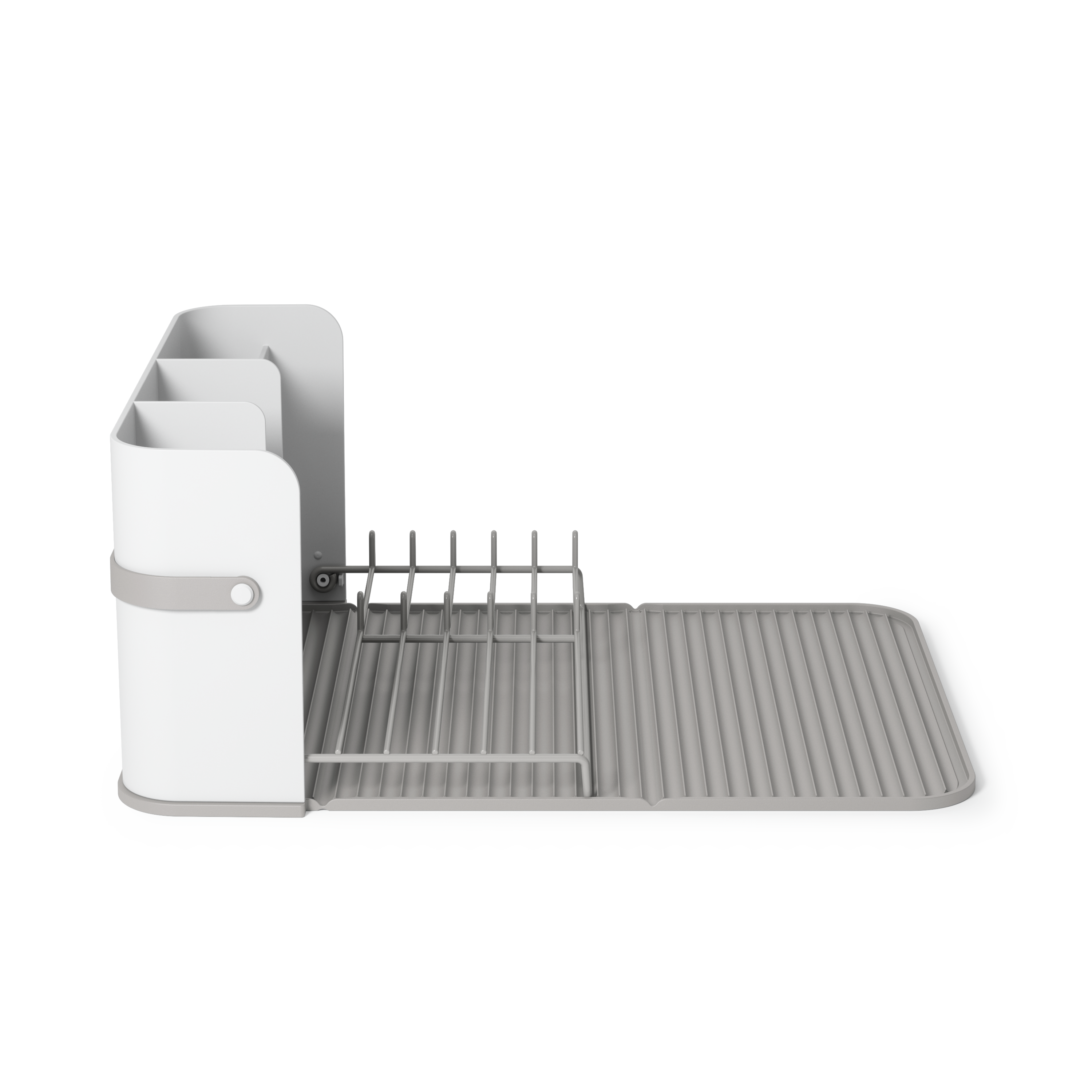 The SLING DISHRACK features a metal foldaway rack and a folding mat that fits perfectly into a convenient caddy base. The base has three divided sections for your cutlery, large utensils, or dish cleaning accessories like sponges and scrub brushes.