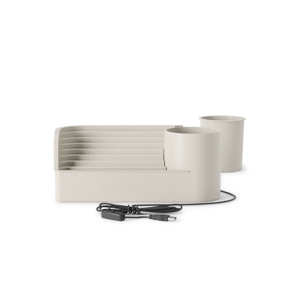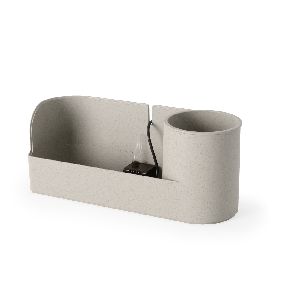 Introducing the Umbra Stream Water Fountain – modern style and convenience meet relaxation! This tabletop fountain offers more than just ambiance to any home or office space; it also helps improve air quality by adding moisture to dry air. The internal MAX/MIN water line indicates how much water is needed to smoothly run the Stream Water Fountain. Keeping water within these lines controls the level of sound creating the gentle, soothing trickle of water. The Stream has plenty of room for 3.5″ planters or stationaries, so you can add elements to this piece that will complement your décor perfectly. Since it’s powered by a simple USB plug, you won’t have to worry about cords and can easily control it with the on/off switch on the cord. Will run for 50 hours between refills at max water line. Measures 12.5 x 4.5 x 5.38″ (32 x 11 x 14 cm). ⓘ Do not place on surfaces or tabletops that have potential to be water damaged. The Stream Water Fountain is composed of recycled plastic with a recycled mixed wood fiber, adding a natural texture to the surface. This material is easy to clean, and long lasting. For consistent water flow, we recommend allowing the water to run for a few days. If you are hearing the motor, ensure you are keeping water within the min-max line. If motor starts grinding, STREAM needs to be topped up with more water.