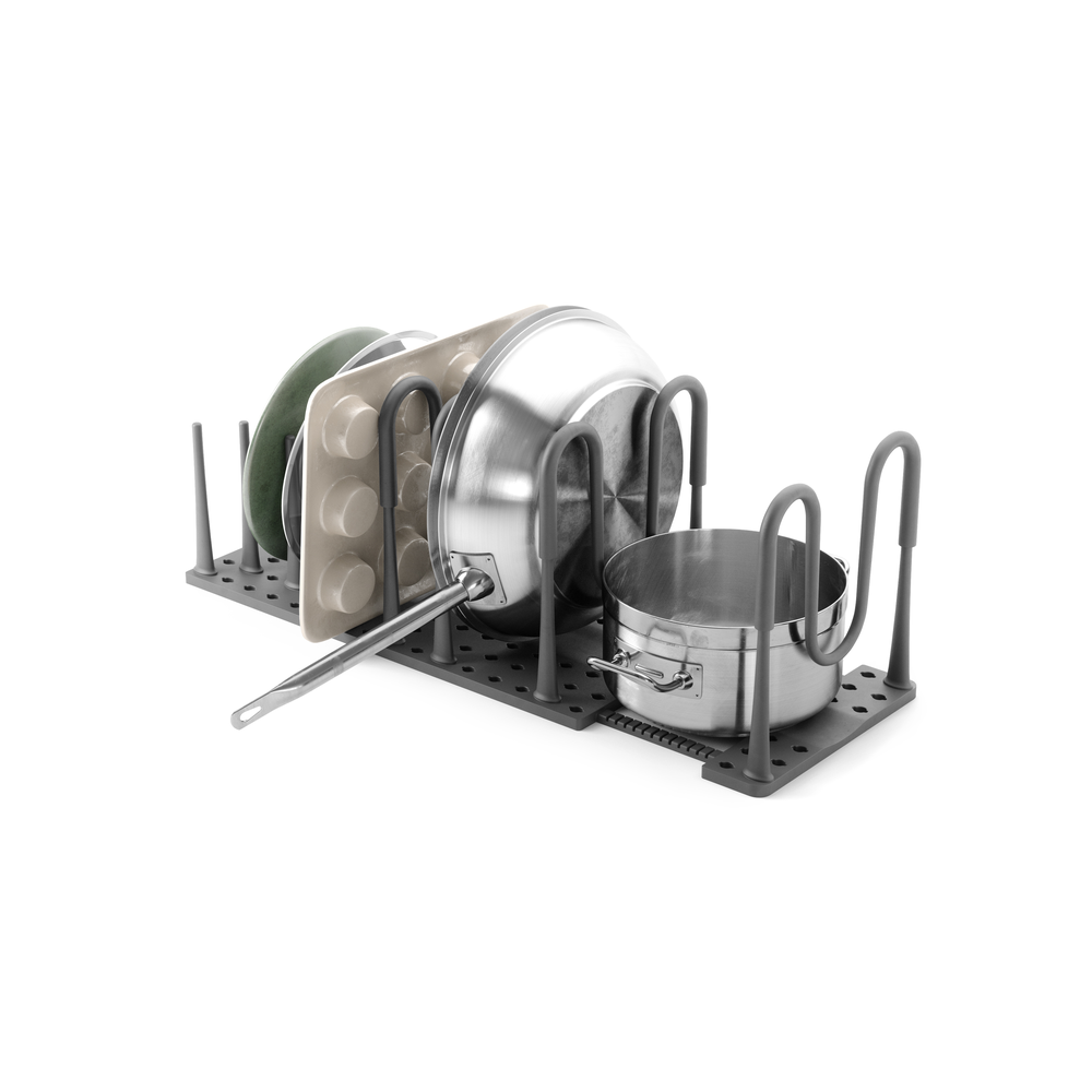Introducing the Peggy Cookware Organizer – the ultimate solution for keeping your kitchen neat and your cookware easily accessible. Designed with functionality and style in mind, Peggy Cookware Organizer eliminates the hassle of stacking and unstacking, offering a seamless and organized way to store your pots, pans, lids and more. Extends to fit any unique cabinet space with its adjustable base and configurable pegs. It helps to keep heavy pots, pans and their lids upright, visible and easily accessible. Peggy Organizer includes 18 pegs and 4 peg extensions to store all your cookware, no matter how large. Simply twist the pegs to secure them into the base – no tools or hardware required.