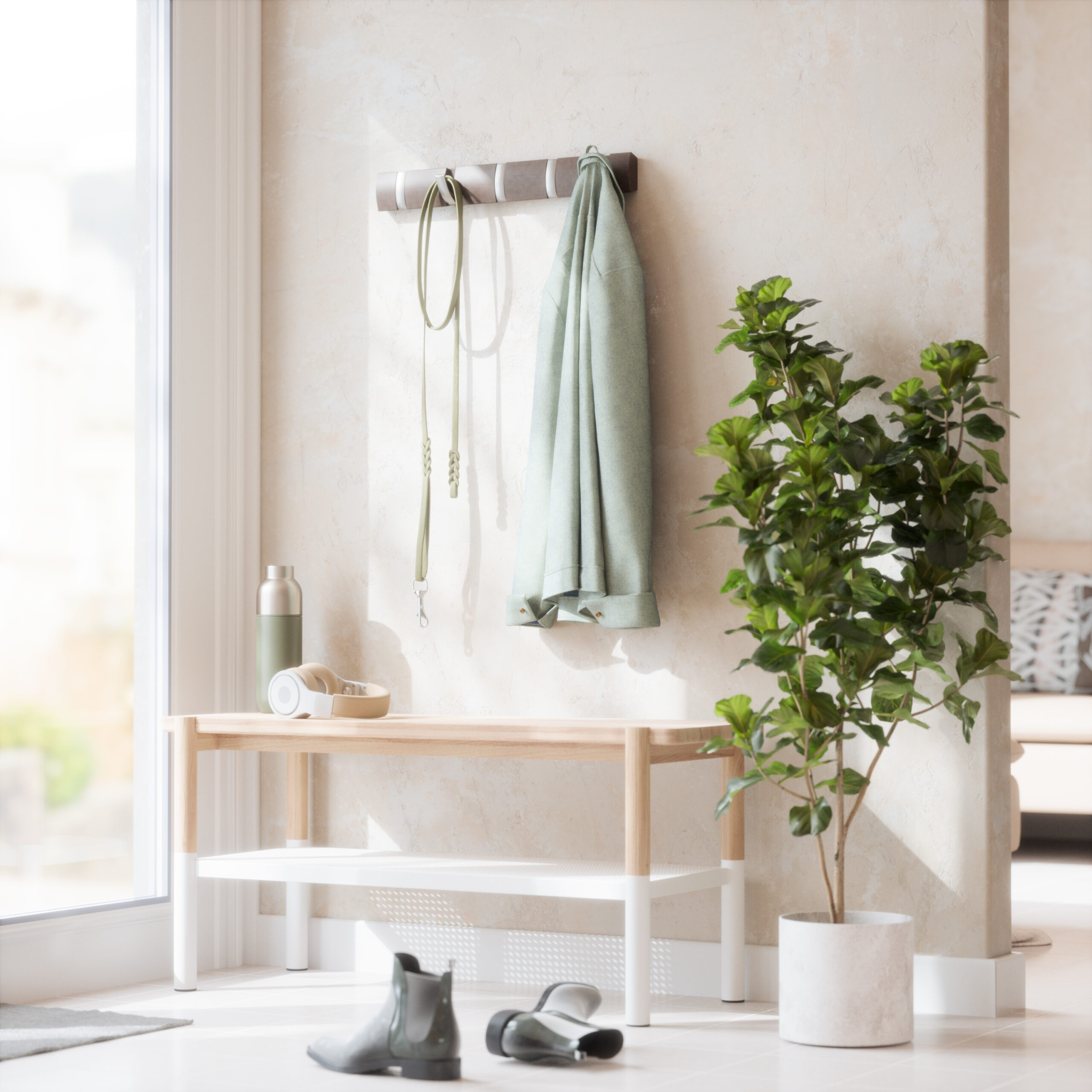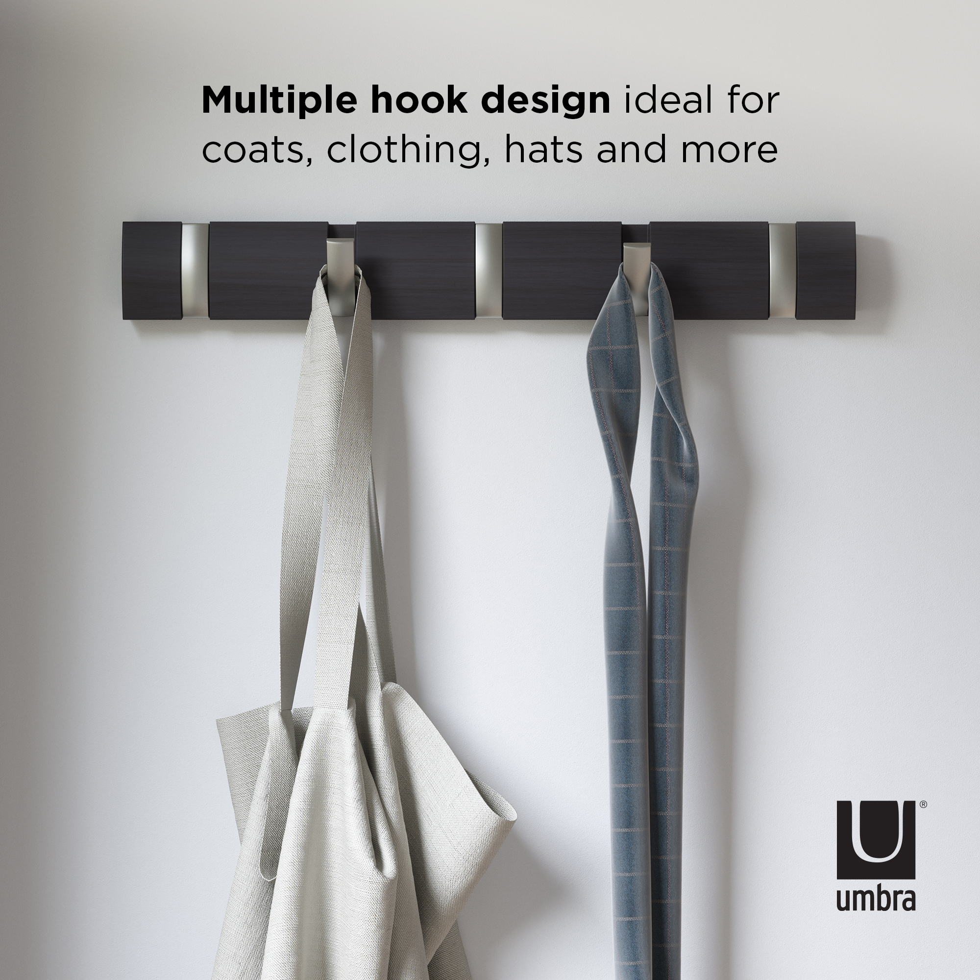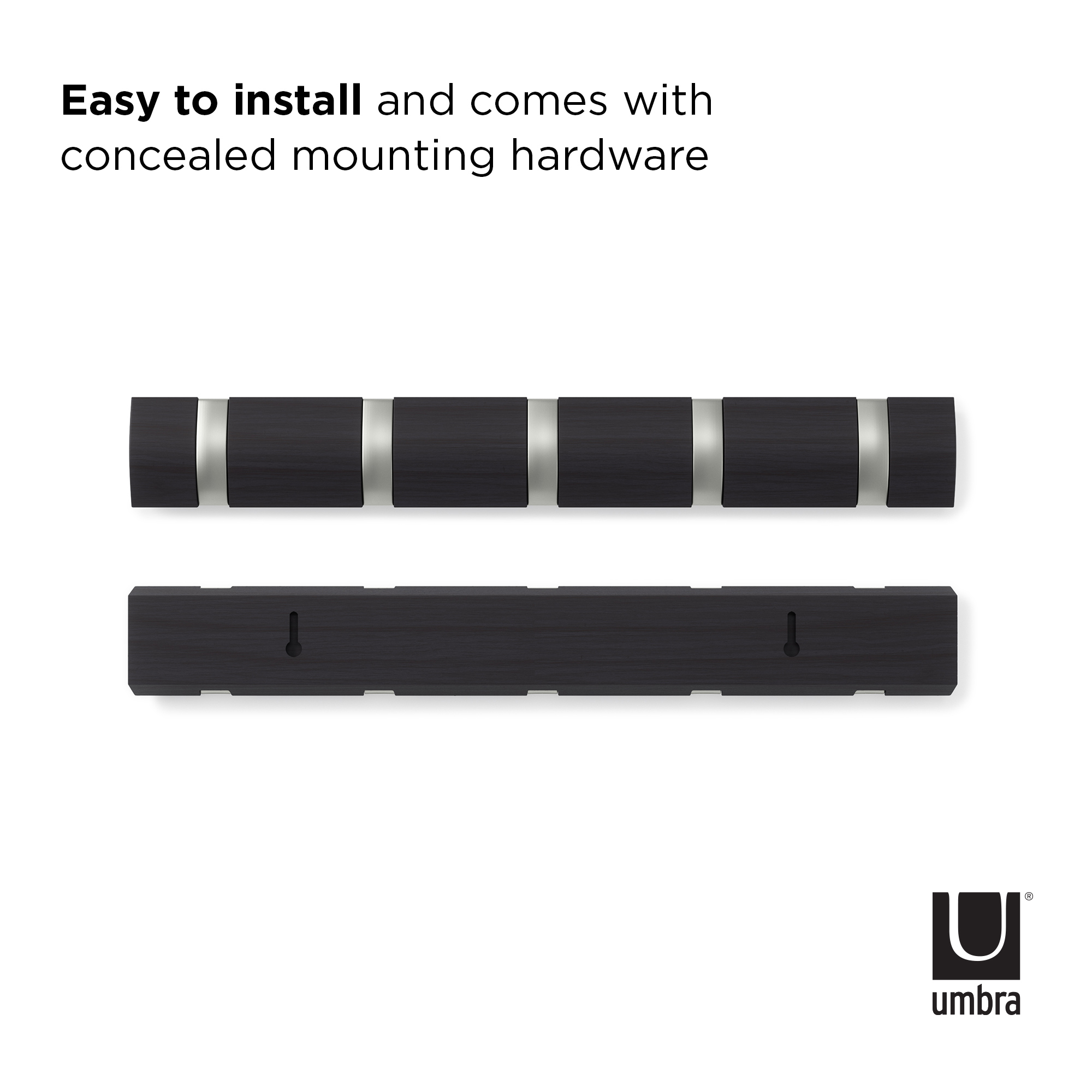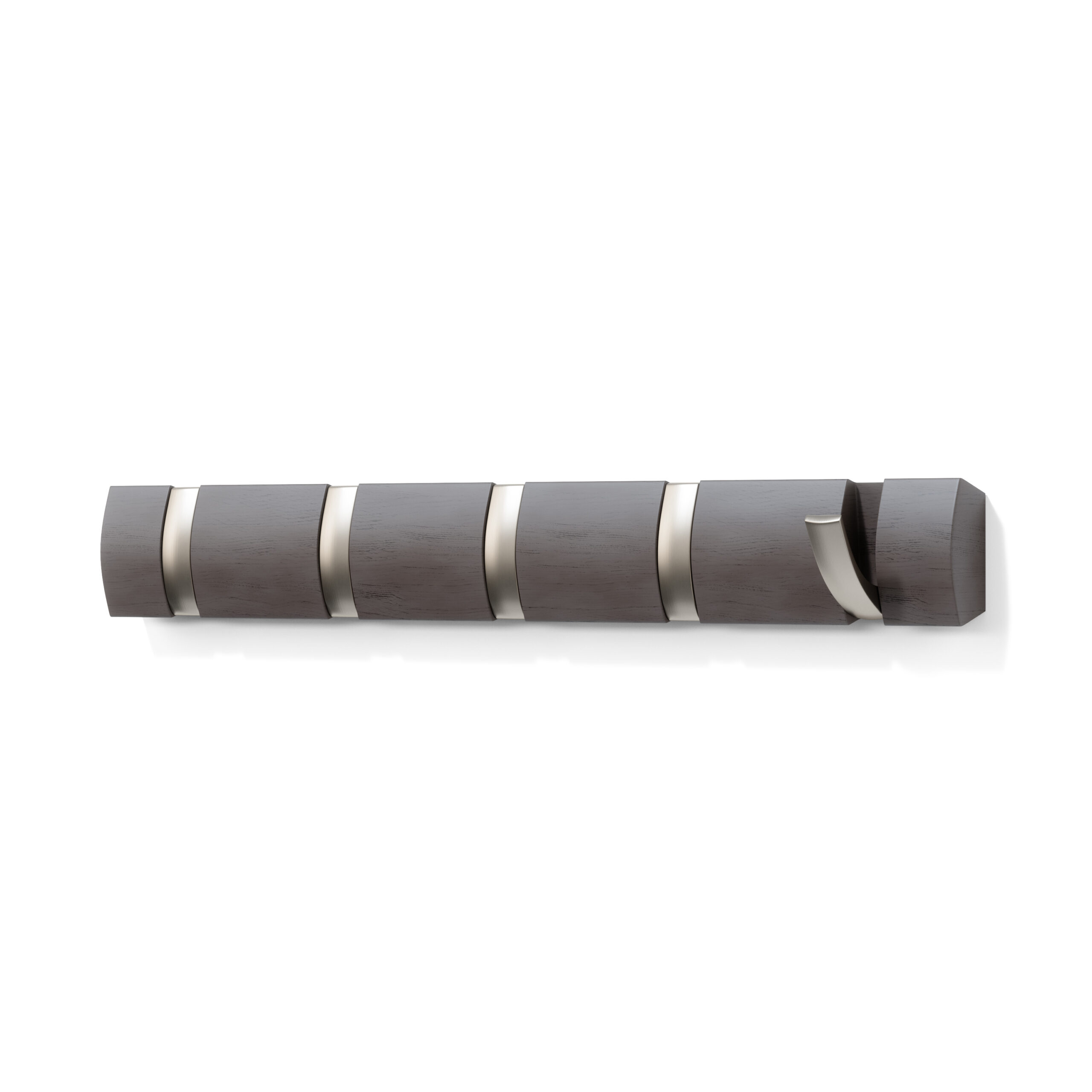 Flip is a modern yet functional, wall mounted coat rack with ample hanging space where you need it most. Flip boasts a clever design with multiple hooks that retract when not in use, each one slipping neatly back into its groove for a sleek look and space-saving functionality. But don’t let the compact look fool you, because Flip can accommodate a surprisingly large number of items making it the perfect spot to hang coats, scarves, purses, and more for you, your family and your guests. Thanks to the sleek profile and hidden mounting hardware, Flip mounts seamlessly to virtually any wall and offers styling that looks great in any entryway or foyer, regardless of how big or small it is. Measures 20 x 2.5 x 1.25 inches (51 x 6 x 3 cm). Wood is a unique natural material with variations in tone, texture, and grain. The product may vary from our imagery. ⓘ For Best Care: wipe with a clean damp cloth