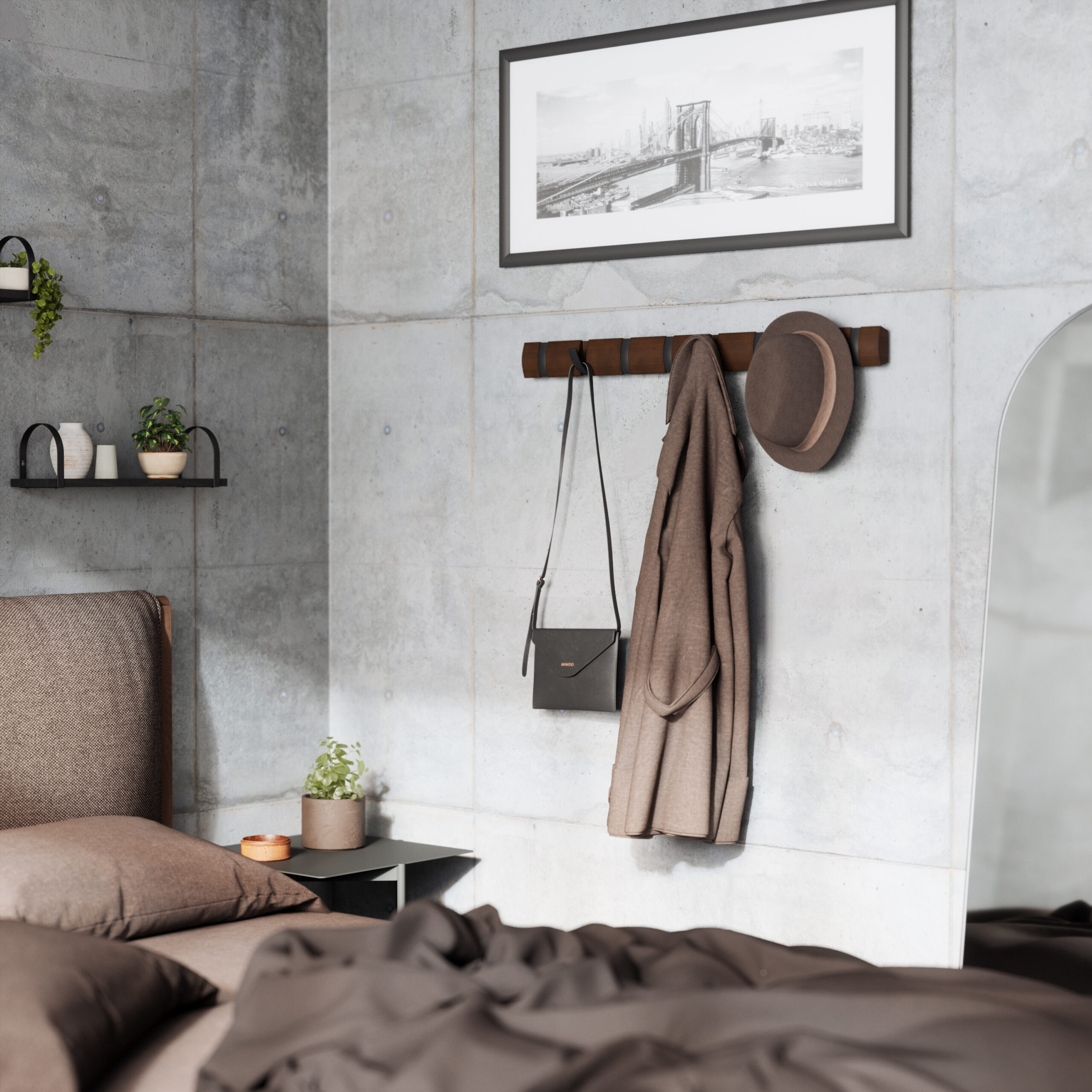 Flip is a modern yet functional, wall mounted coat rack with ample hanging space where you need it most. Flip boasts a clever design with multiple hooks that retract when not in use, each one slipping neatly back into its groove for a sleek look and space-saving functionality. But don’t let the compact look fool you, because Flip can accommodate a surprisingly large number of items making it the perfect spot to hang coats, scarves, purses, and more for you, your family and your guests. Thanks to the sleek profile and hidden mounting hardware, Flip mounts seamlessly to virtually any wall and offers styling that looks great in any entryway or foyer, regardless of how big or small it is. Wood is a unique natural material with variations in tone, texture, and grain. The product may vary from our imagery. ⓘ For Best Care: wipe with a clean damp cloth