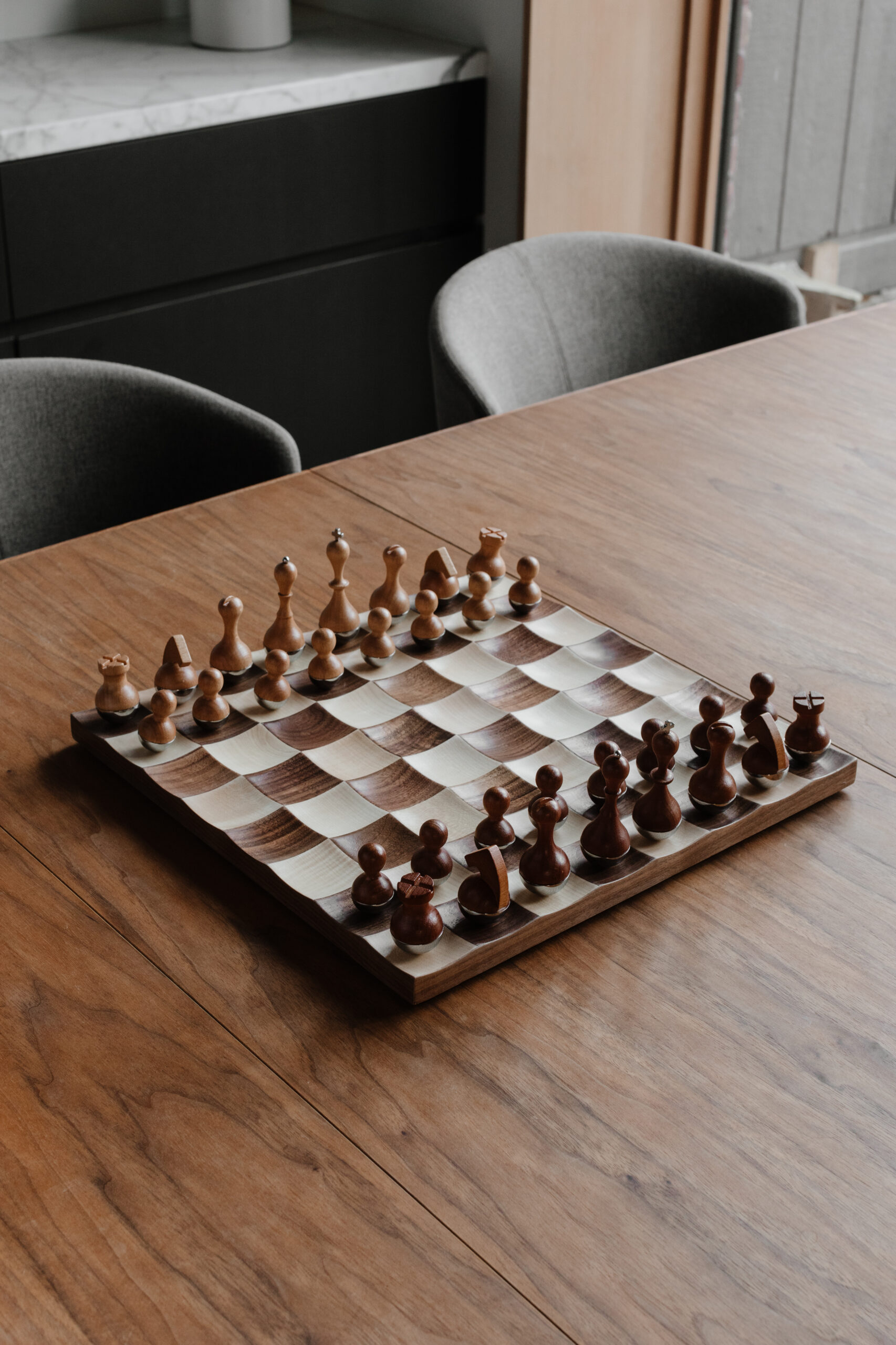 Get ready for a chess set like no other! Introducing the Wobble Chess Set – the perfect combination of classic and modern. With its concave landscape, this set brings a whole new level of excitement to the game. The freely quivering chess pieces add a lively interaction between the board and the pieces. It’s the ultimate showpiece for your living room! Crafted with care, this prize-winning Chess Set is made of beautifully polished maple and walnut wood. But it’s not just about the aesthetics. The board’s unique design also adds motion to the game. Thanks to its concave landscape, the weighted playing pieces can freely move around, adding an extra element of challenge and strategy. Measuring at 14.88 x 14.88 x 4.5 inches (38 x 38 x 11 cm), this Wobble Chess Set is the perfect size to fit in any space. Its natural wood finish adds a touch of warmth to any room. So why settle for a regular chess set when you can have one that wobbles? Wood is a unique natural material with variations in tone, texture, and grain. The product may vary from our imagery.