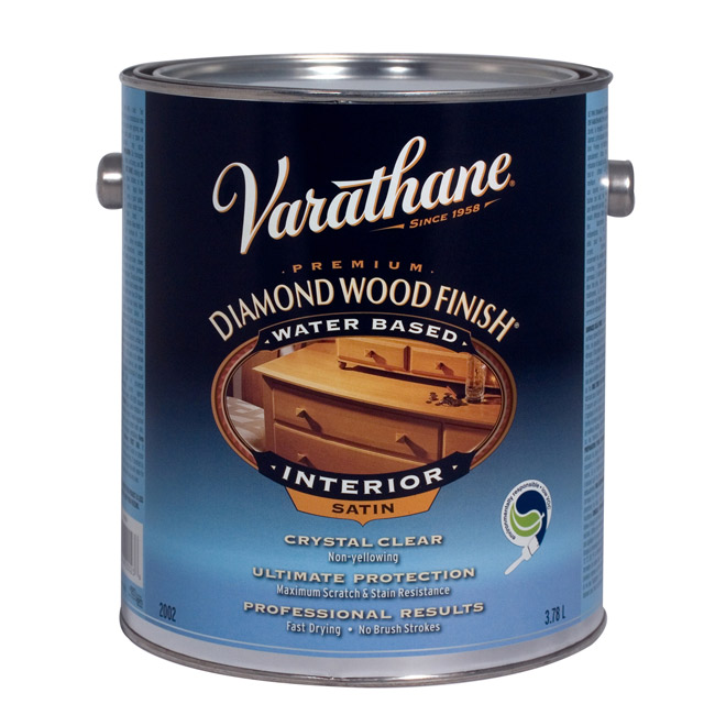 Floor varnish. 3.78 L. Water-based. Clear satin gloss. Diamond finish. Non-yellowing. Easy water clean-up. Used for protecting and preserving the beauty of wood.