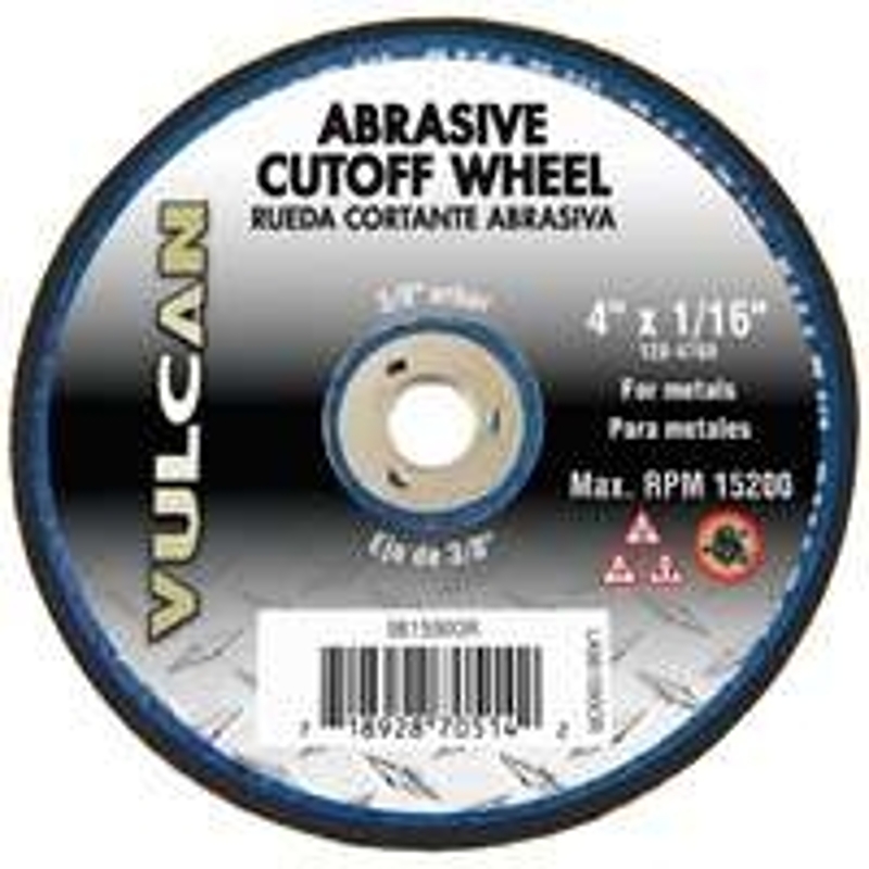 The Vulcan cut-off wheel material is aluminum oxide. The arbor size is 3/8 in, the diameter is 4 in Dia and the thickness is 1/16 in. Suitable to use on metal.