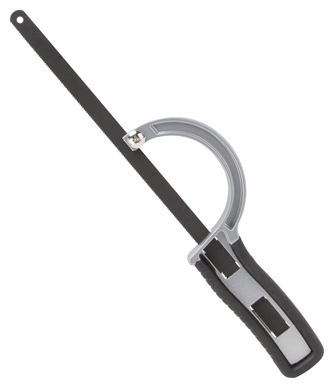 The Vulcan mini hacksaw blade teeth are 18 per inch with a blade length of 12 in L. The blade material is HCS. This hacksaw has a rubber comfort-grip handle.