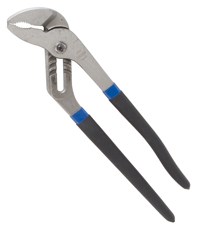 Groove joint pliers are made from steel and feature curved jaw and non-slip, vinyl handles, 12 in OAL. Chrome-plated finish.